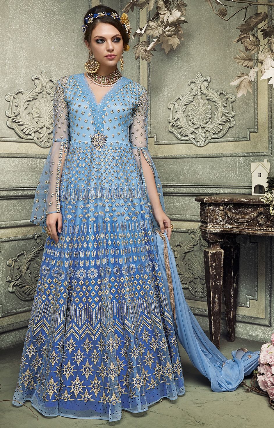Blue color Gown in Net fabric with Embroidered, Stone, Thread, Zari work