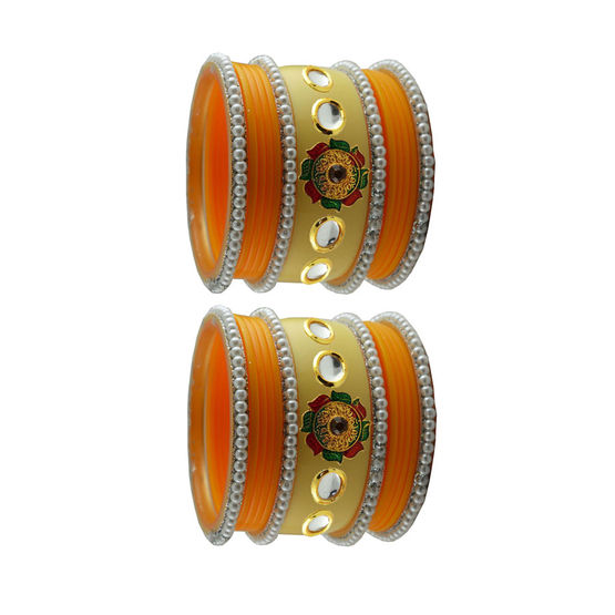 Enamel Orange, Yellow color Bangles in Metal Alloy studded with CZ Diamond