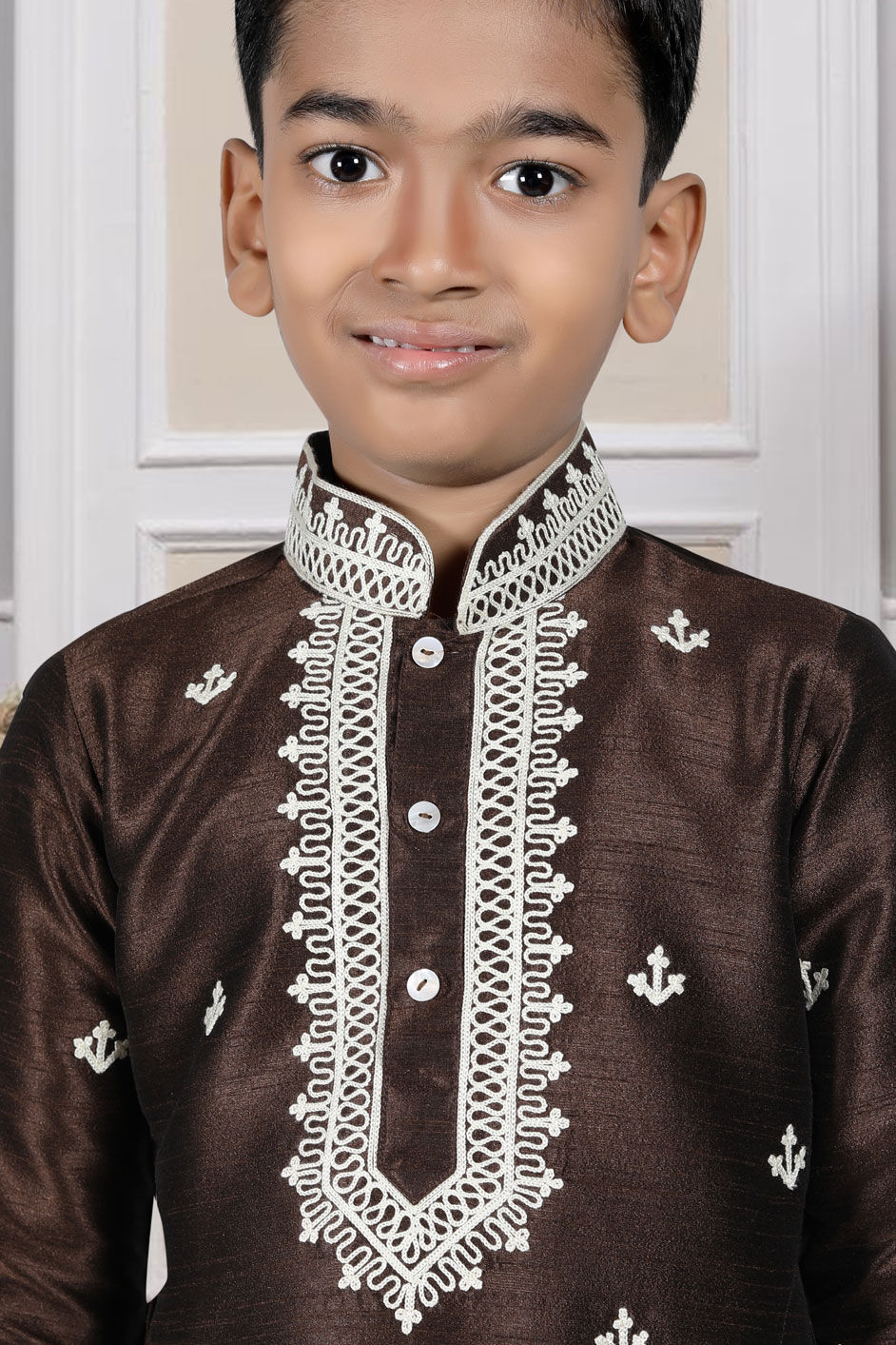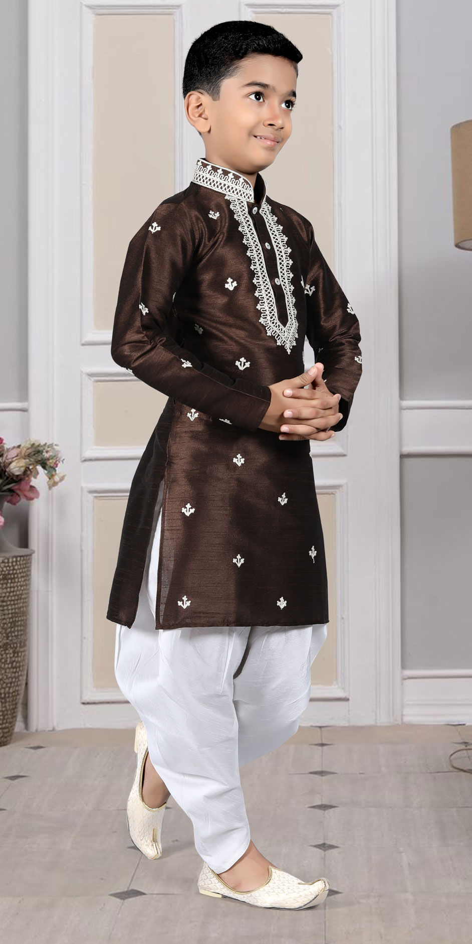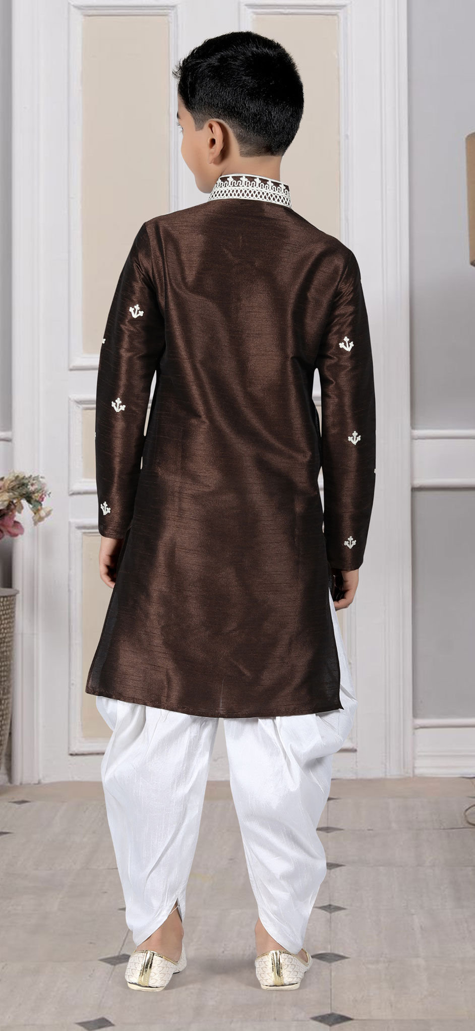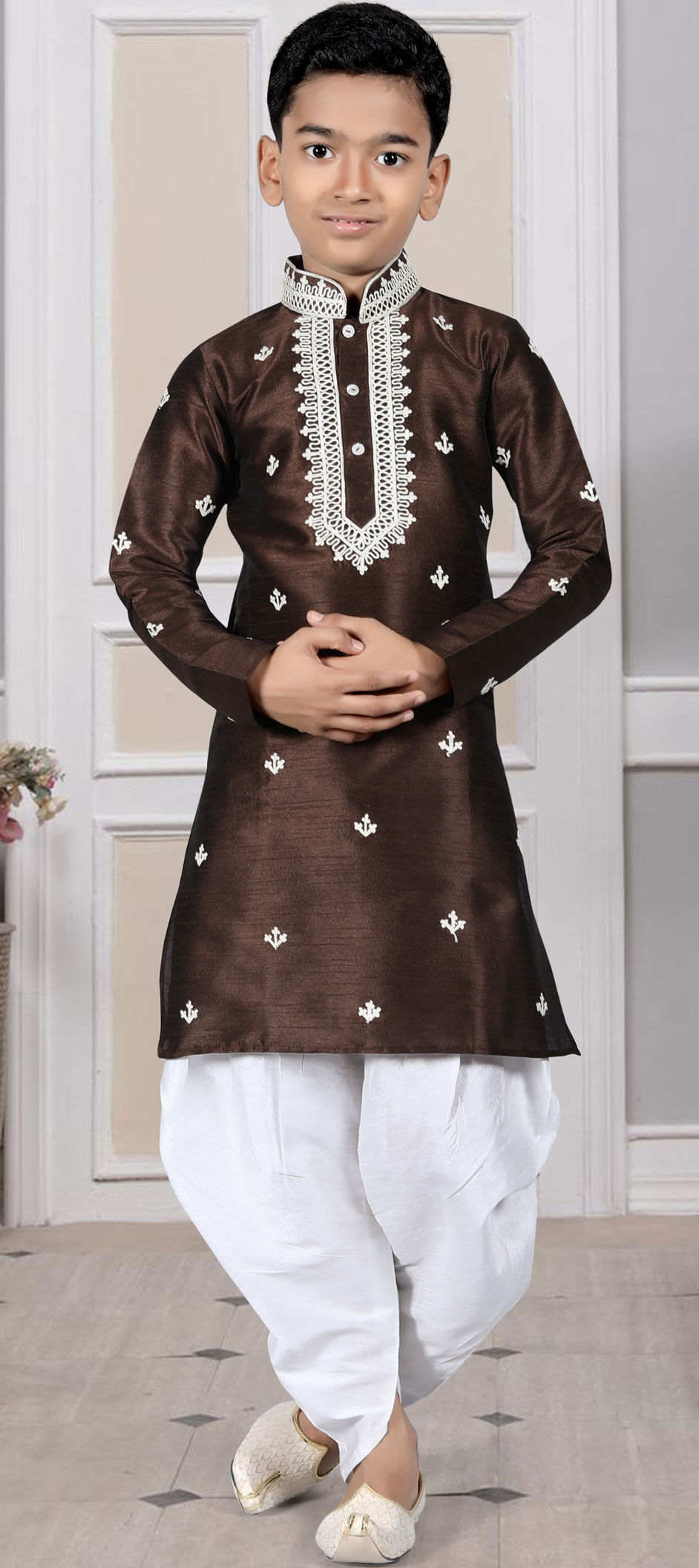 Beige and Brown color Boys Dhoti Kurta in Art Silk fabric with Embroidered work