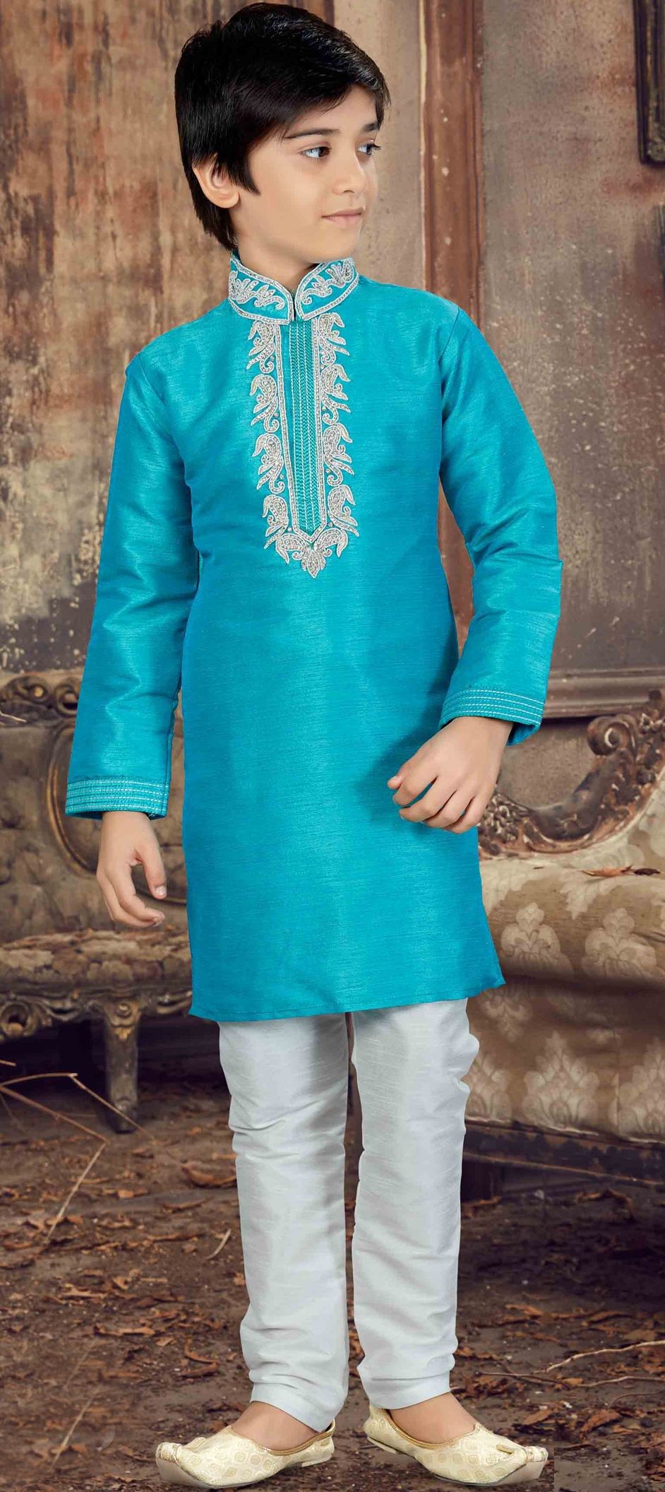 1532024: Blue color Boys Kurta Pyjama in Bangalore Silk fabric with Stone work