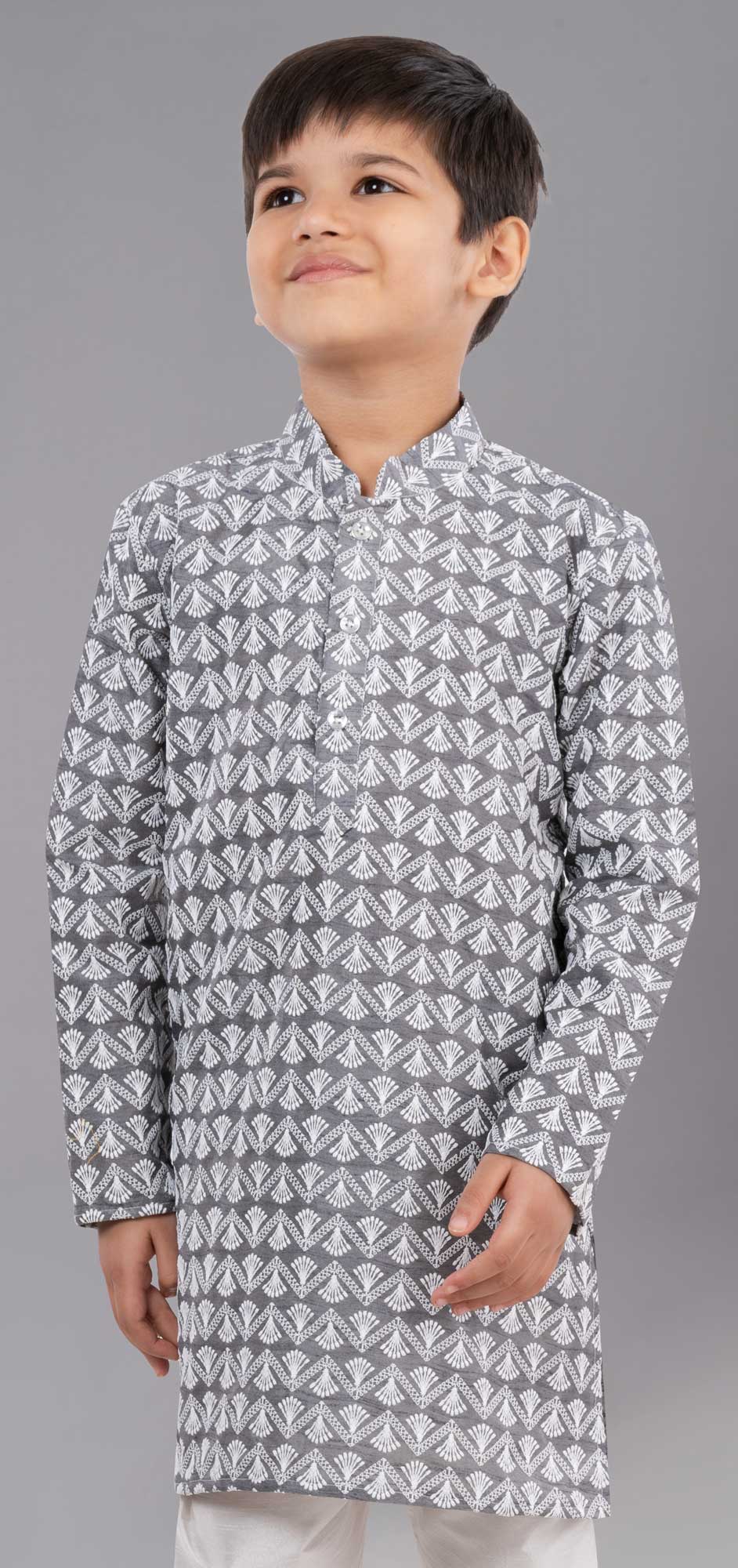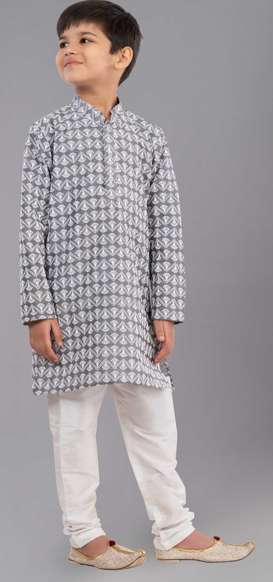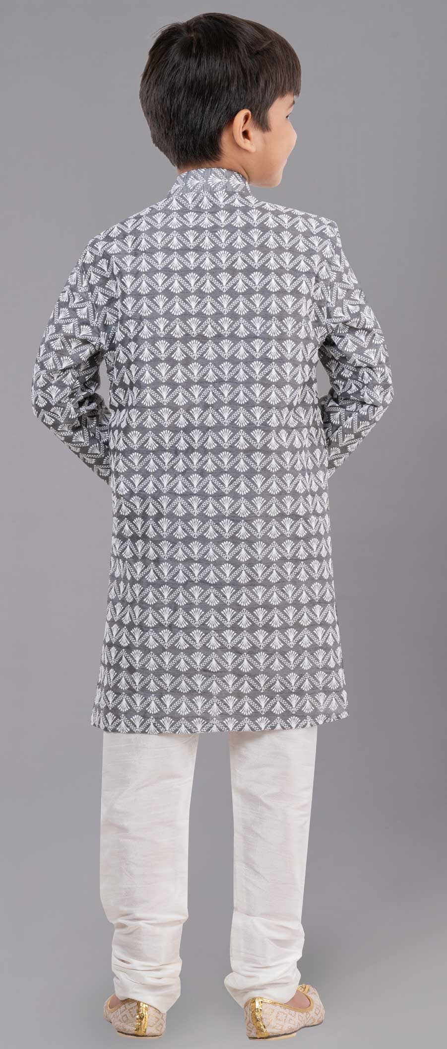Silk cotton Boys Kurta Pyjama in Black and Grey with Embroidered work