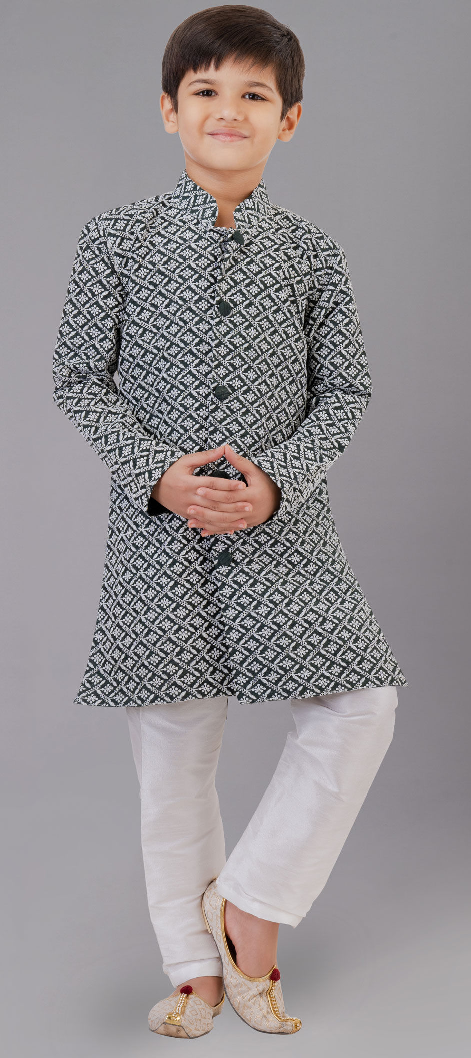 Silk cotton Boys Kurta Pyjama in Black and Grey with Embroidered work