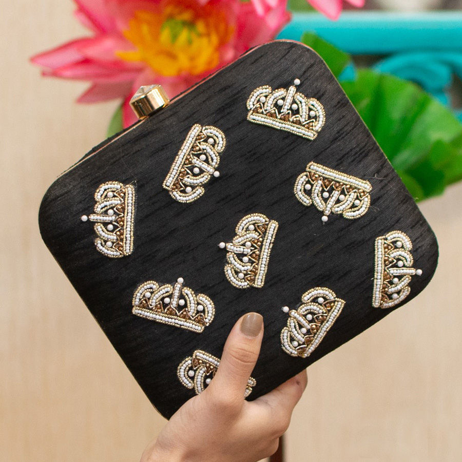 Black and Grey color Clutches in Raw Silk fabric with Bugle Beads, Moti work