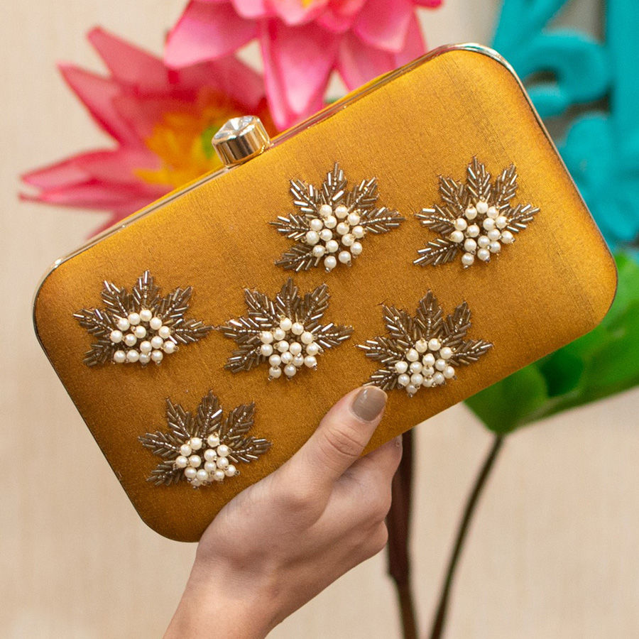 Gold color Clutches in Raw Silk fabric with Cut Dana, Moti work
