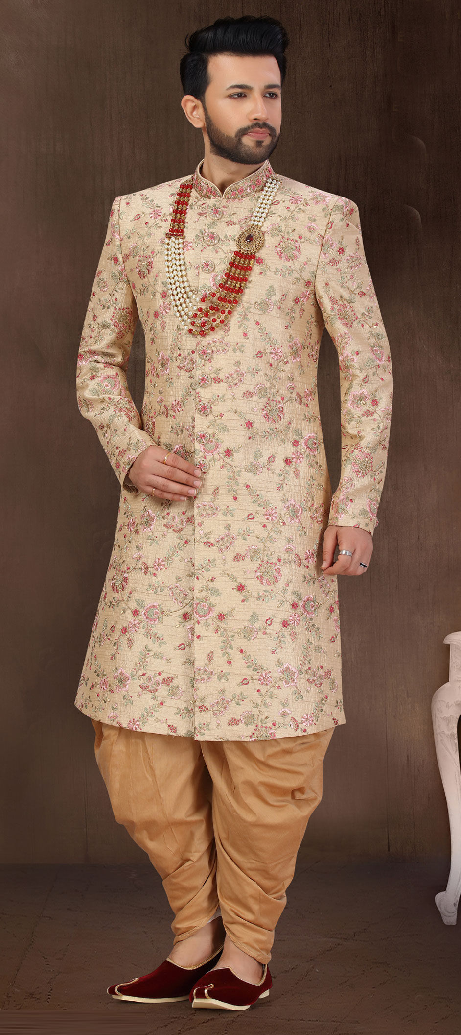 Beige and Brown color Dhoti Sherwani in Art Silk fabric with Embroidered, Resham, Thread work