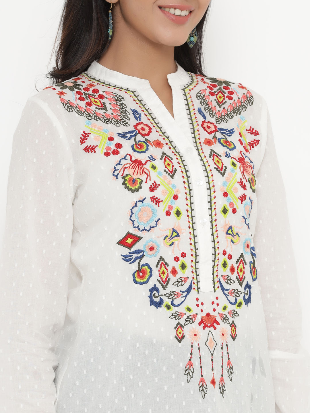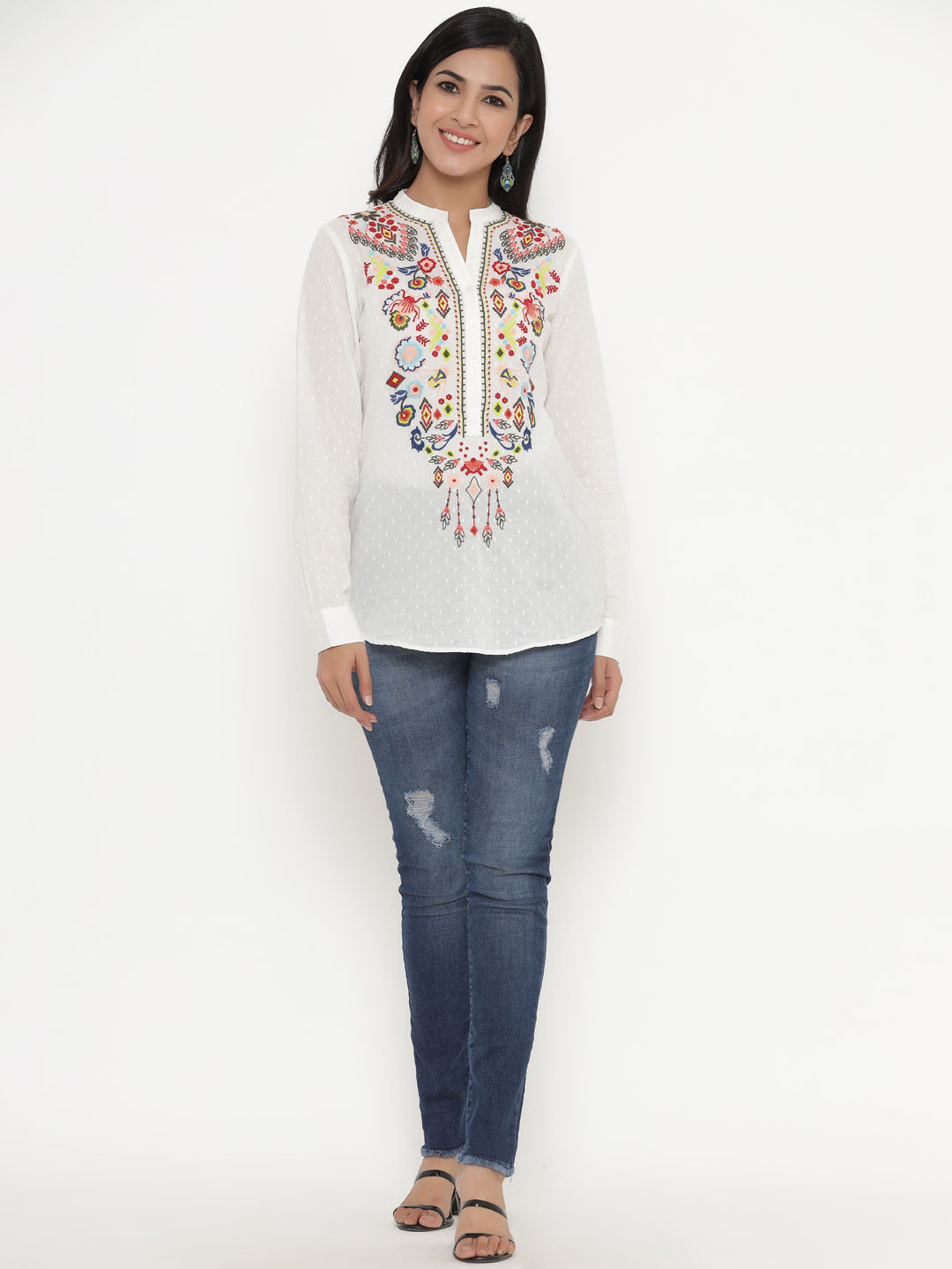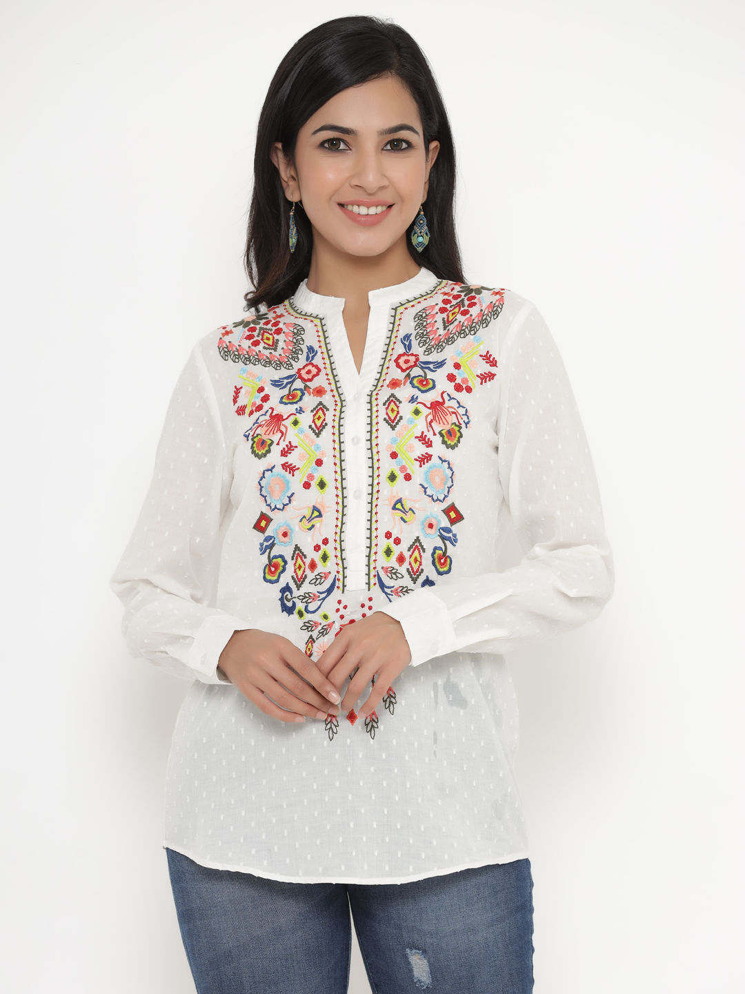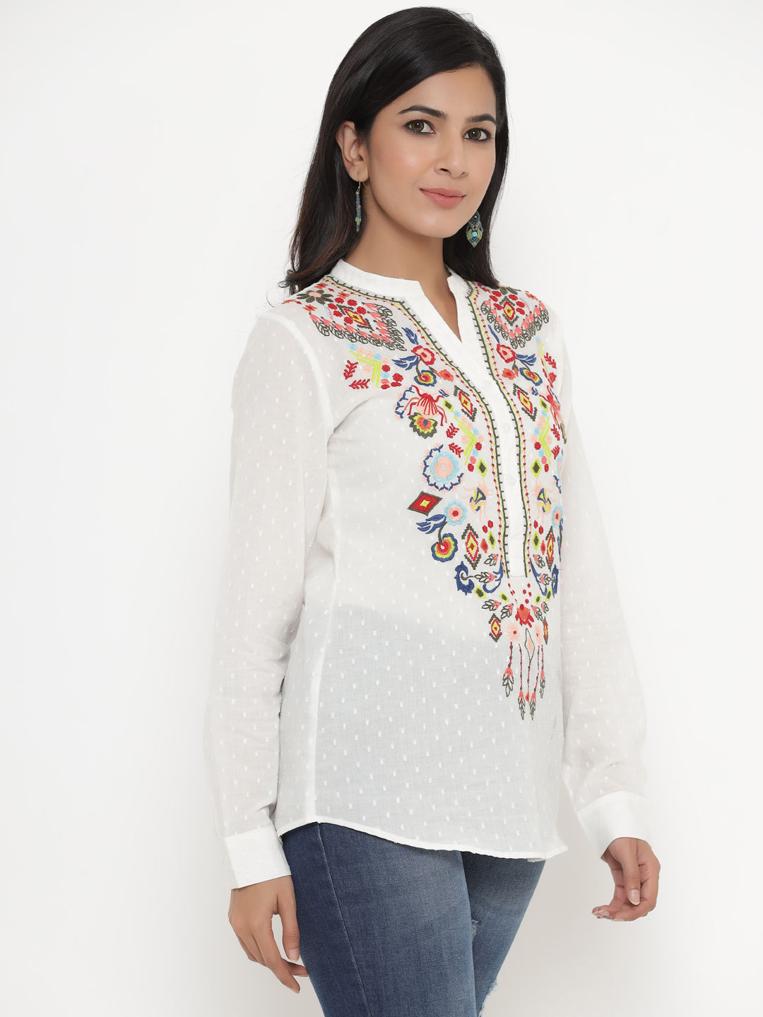 White and Off White color Tops and Shirts in Cotton fabric with Embroidered, Resham, Thread work