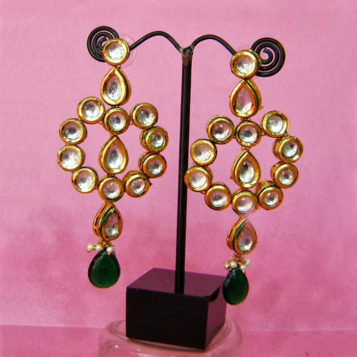 Gold Rodium Polish Gold, Green color Earrings in Metal Alloy studded with Beads, Kundan