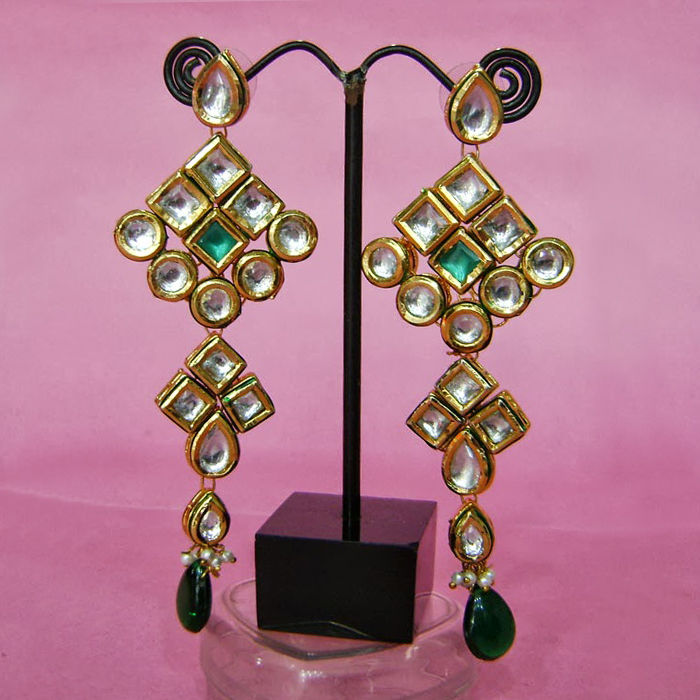 Gold Rodium Polish Gold, Green color Earrings in Metal Alloy studded with Beads, Kundan