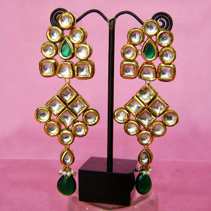 Gold Rodium Polish Gold, Green color Earrings in Metal Alloy studded with Beads, Kundan
