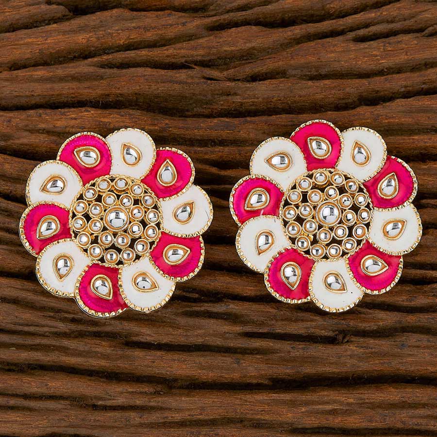 Gold Rodium Polish Pink and Majenta, White and Off White color Earrings in Brass studded with Kundan