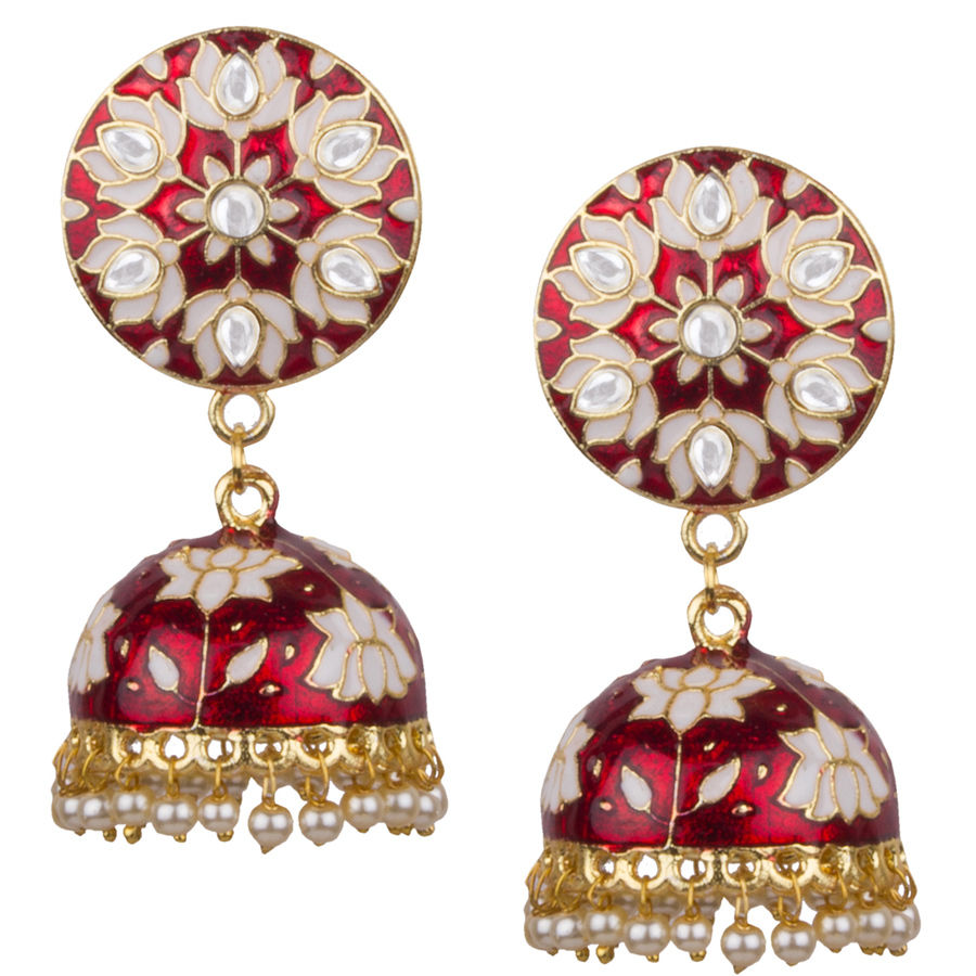 Gold Rodium Polish Red and Maroon, White and Off White color Earrings in Brass studded with Kundan, Pearl