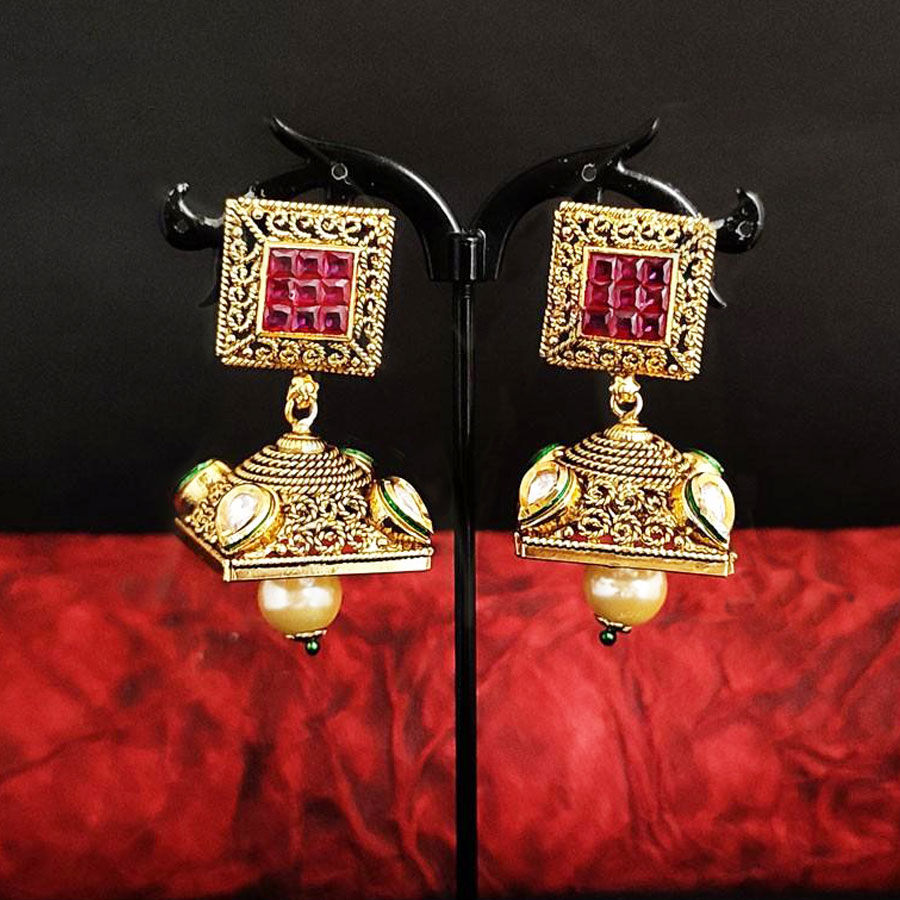 Gold Rodium Polish Red and Maroon color Earrings in Brass, Copper, Metal Alloy studded with Pearl