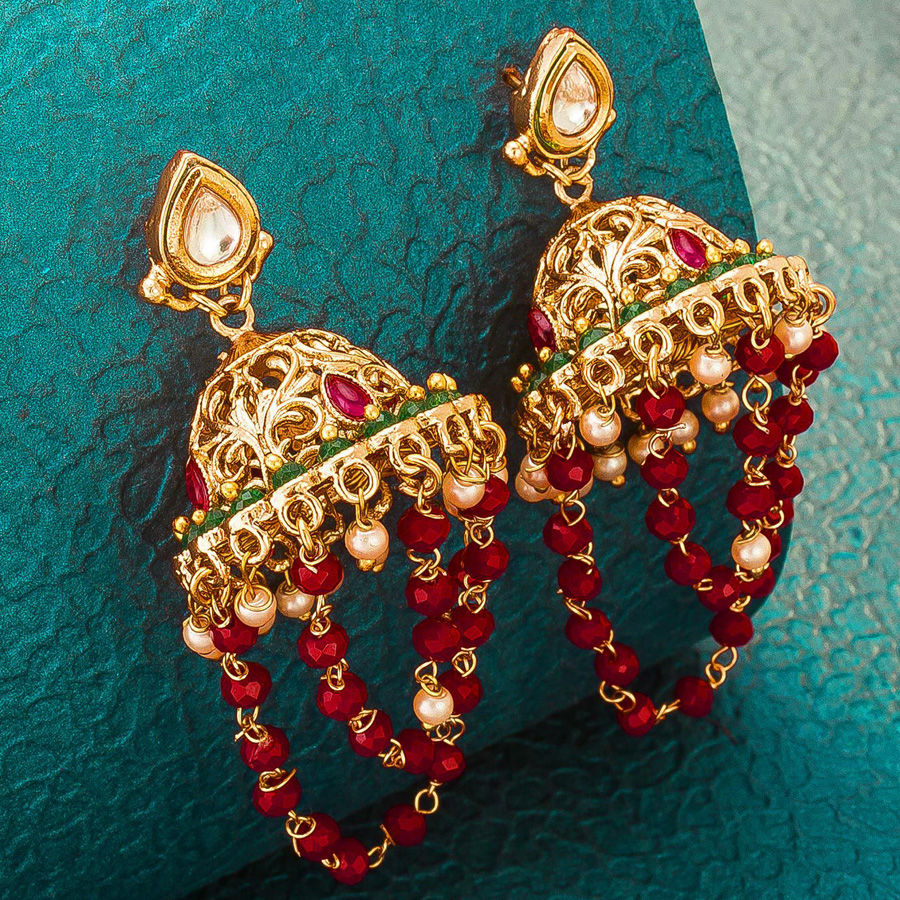 Gold Rodium Polish Red and Maroon Earrings in Metal Alloy with Kundan