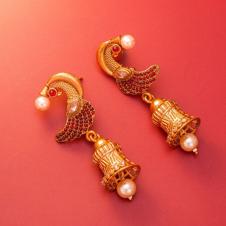 Gold Rodium Polish Red and Maroon color Earrings in Metal Alloy studded with Pearl