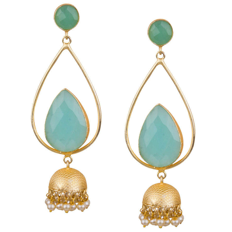 Gold Rodium Polish Green, White and Off White color Earrings in Brass studded with Kundan, Pearl