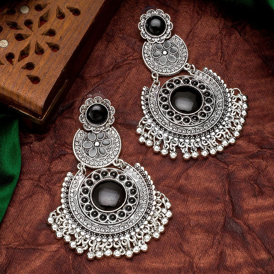 Silver Rodium Polish Black and Grey color Earrings in Metal Alloy studded with Kundan