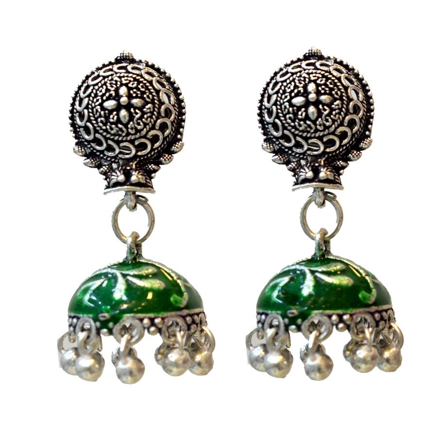 Silver Rodium Polish Green color Earrings in Brass studded with Beads