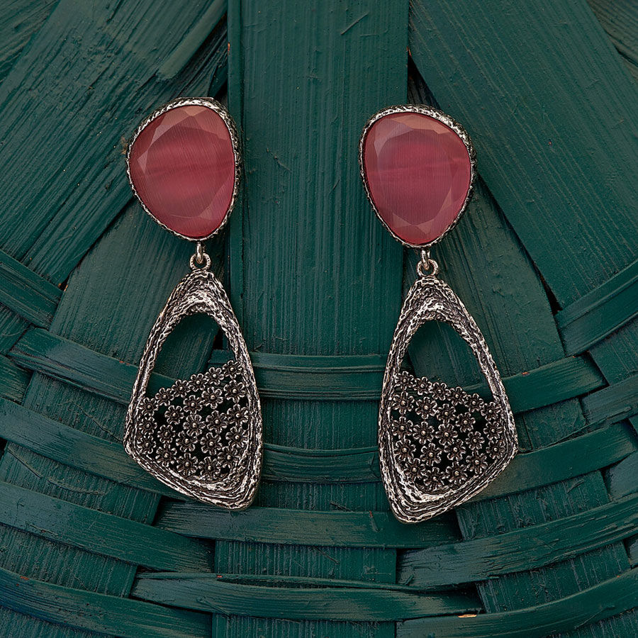 Silver Rodium Polish Pink and Majenta color Earrings in Metal Alloy studded with CZ Diamond