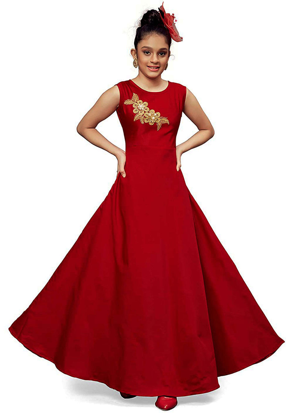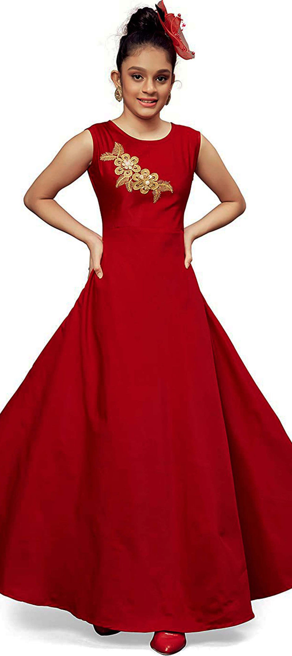 Red and Maroon color Girls Gown in Satin Silk fabric with Embroidered work : 1708037