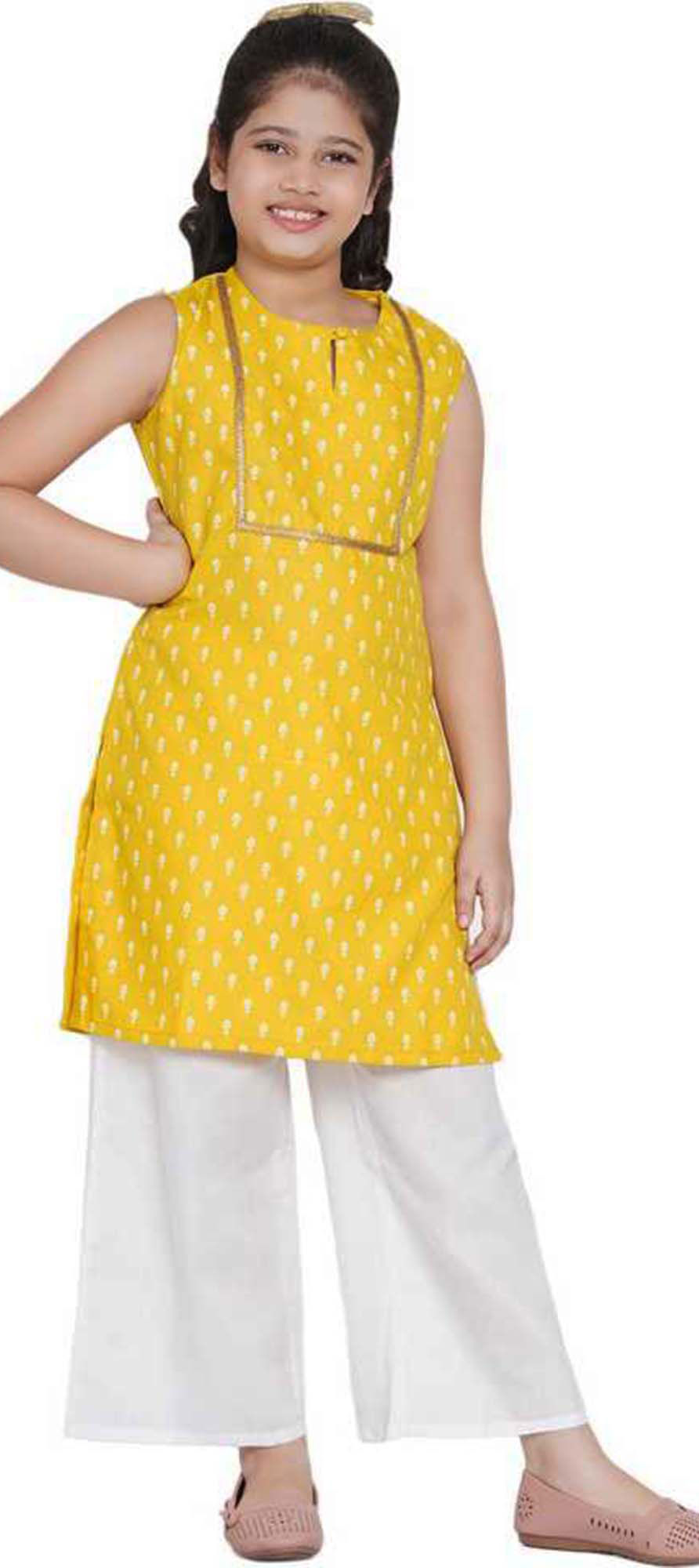 White and Off White, Yellow color Girls Top with Bottom in Blended Cotton fabric with Lace, Printed work : 1764227