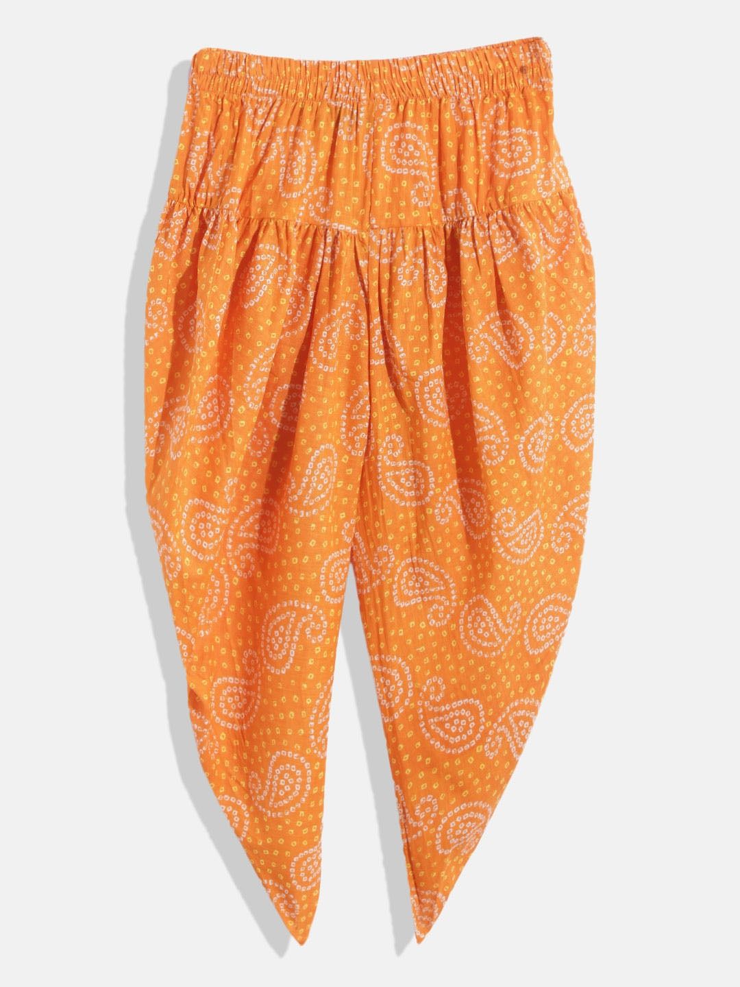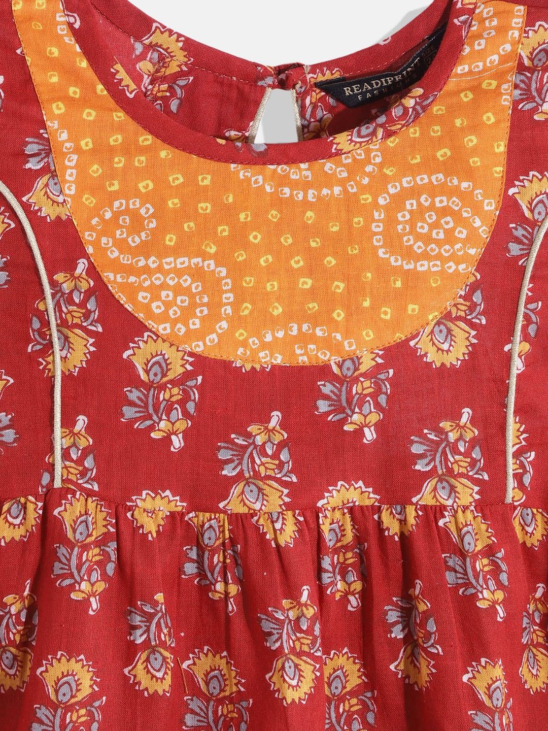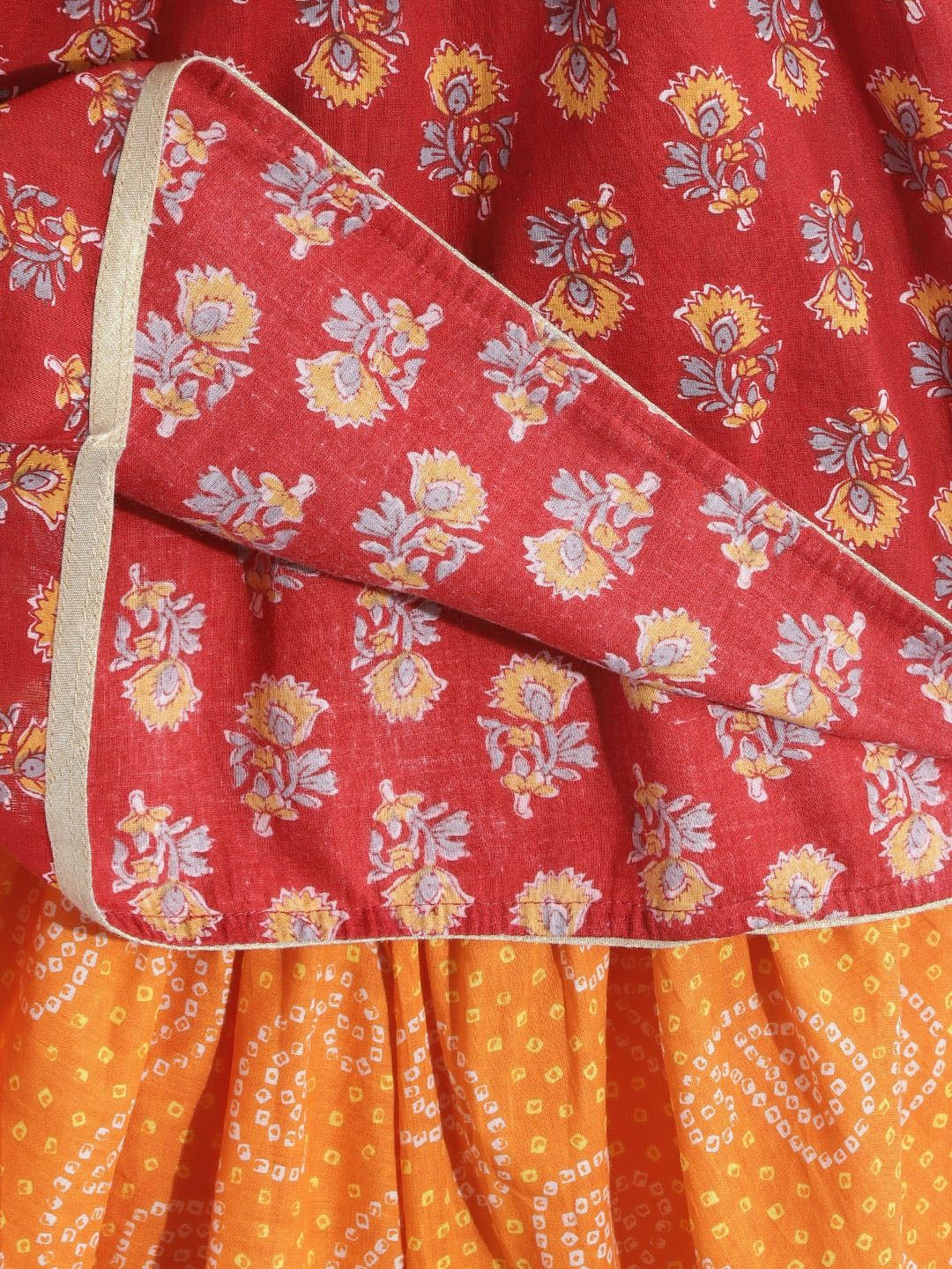 Orange, Red and Maroon color Girls Top with Bottom in Cotton fabric with Bandhej, Printed work