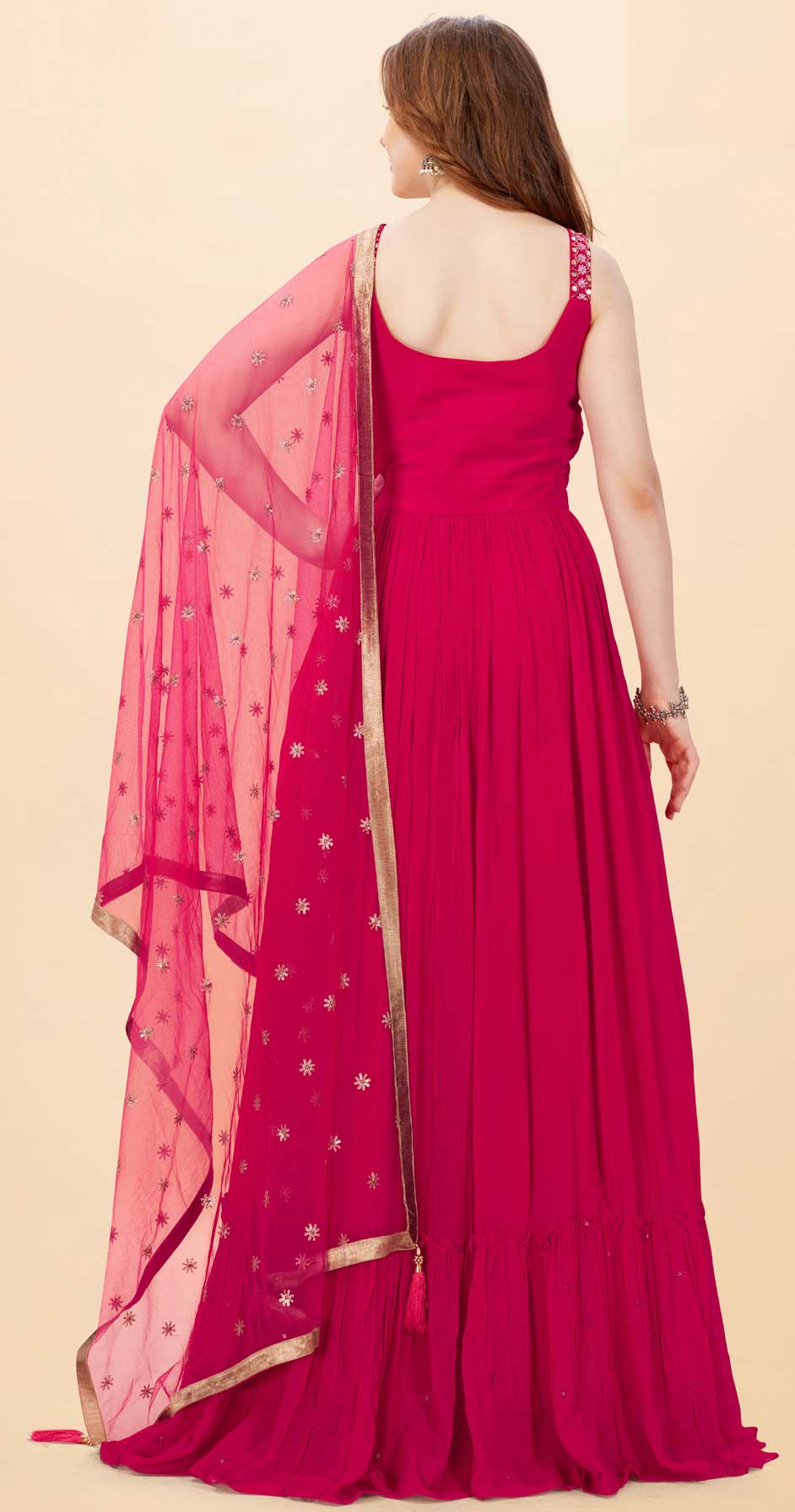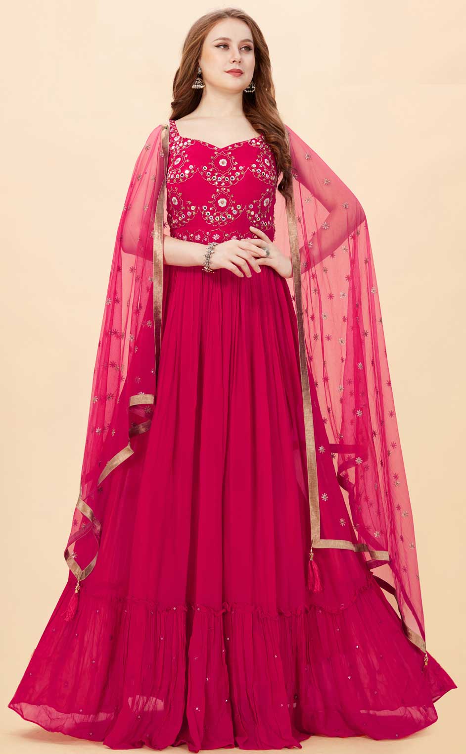 Pink and Majenta color Gown in Faux Georgette fabric with Bugle Beads, Cut Dana, Sequence work