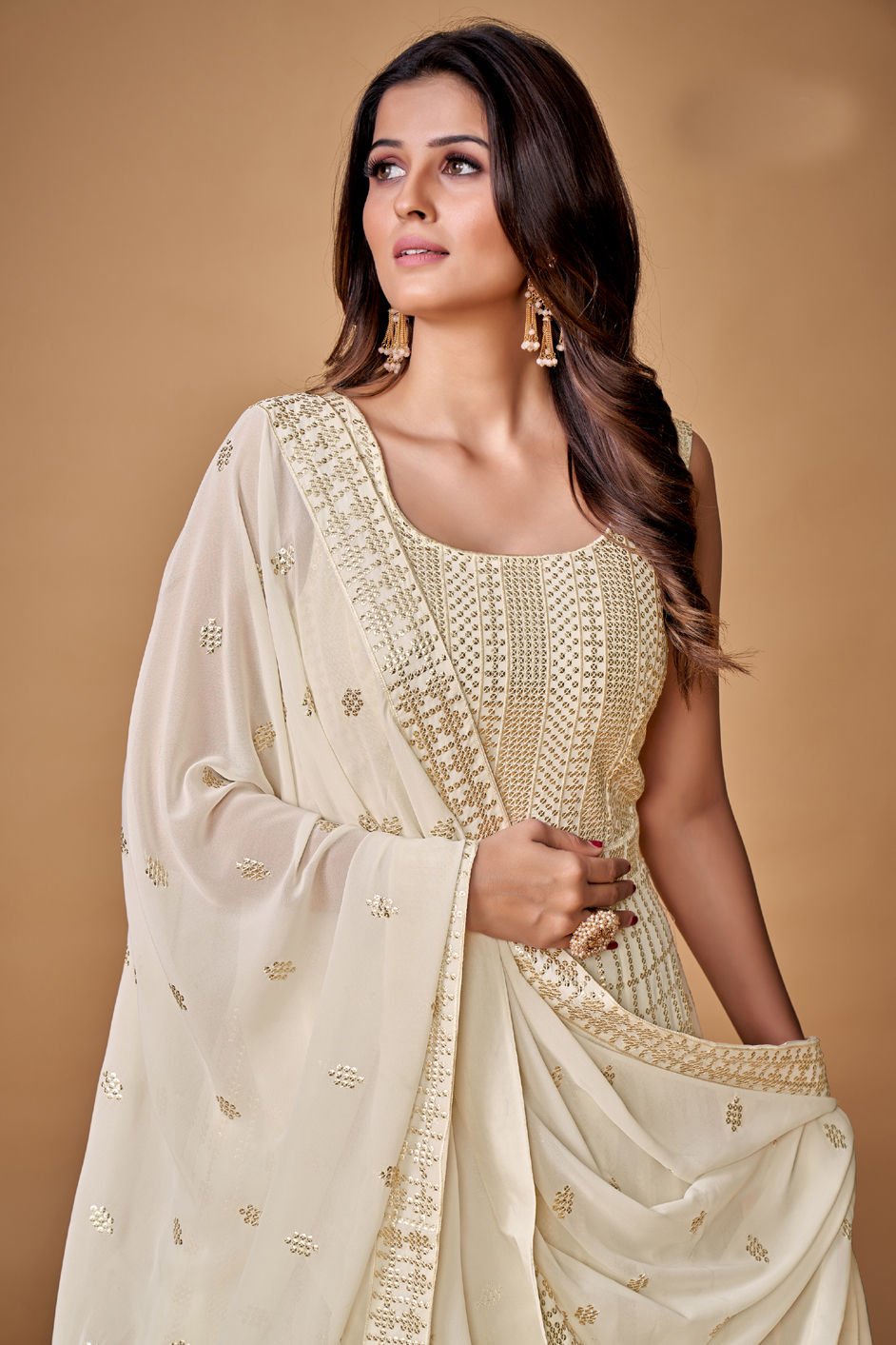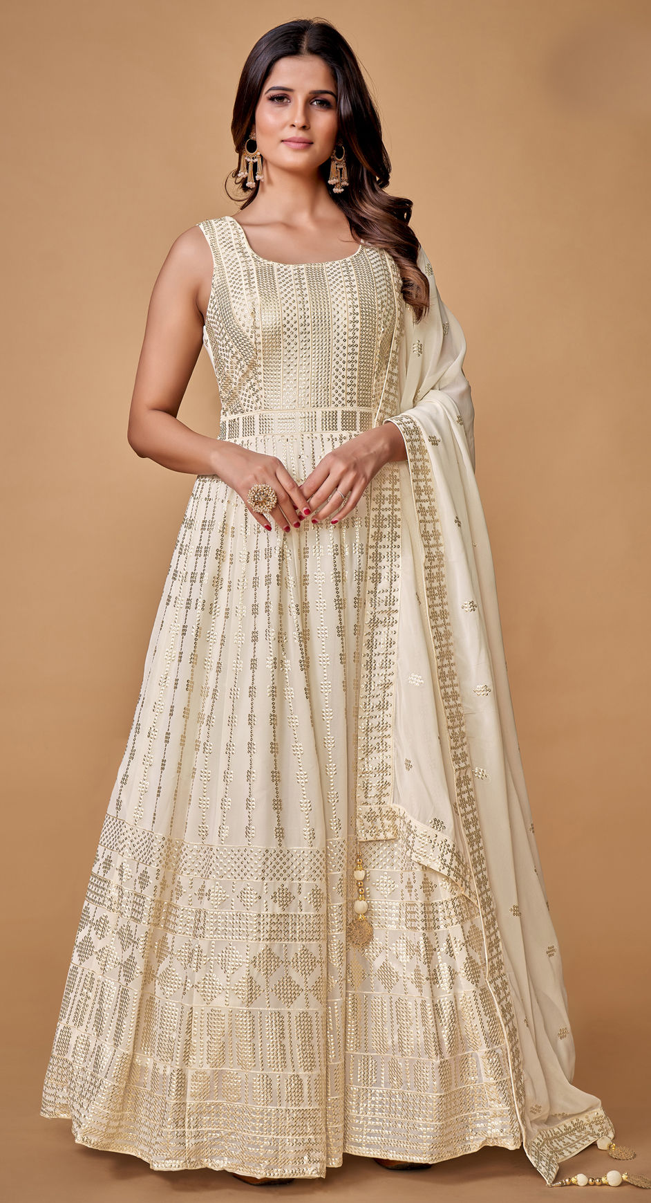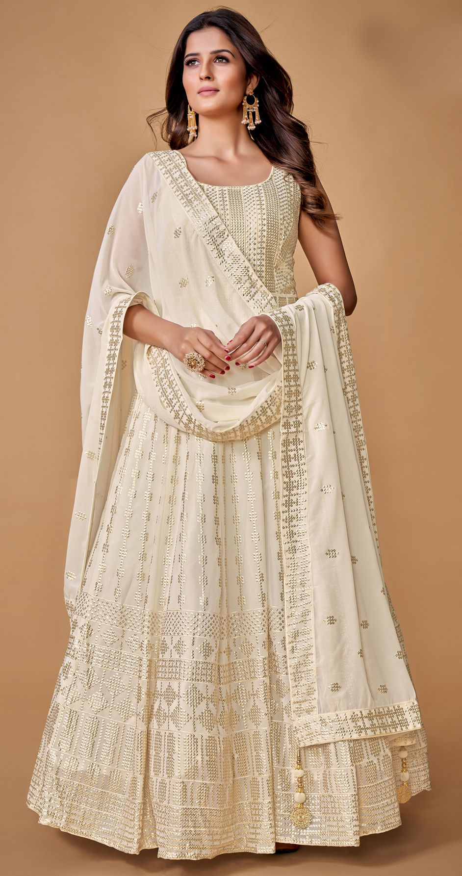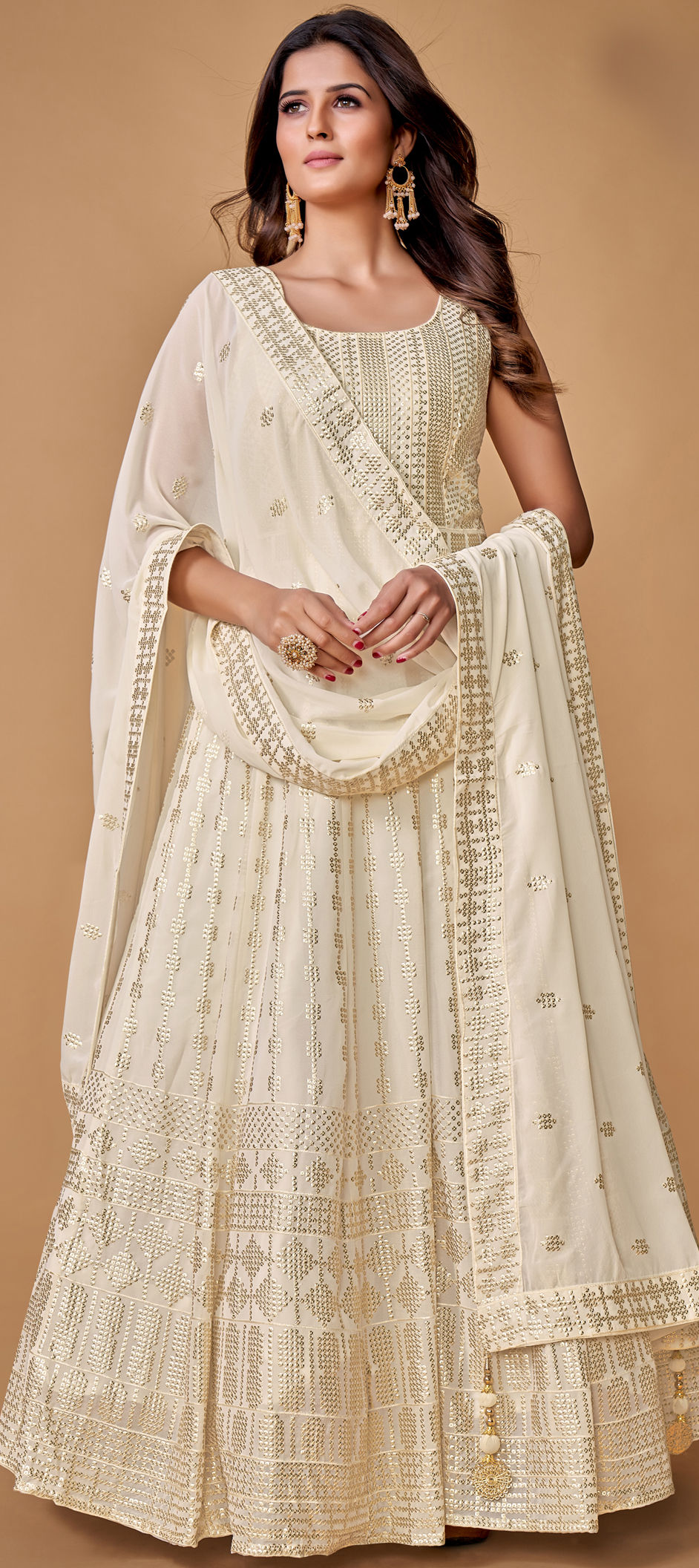 White and Off White color Gown in Georgette fabric with Sequence work