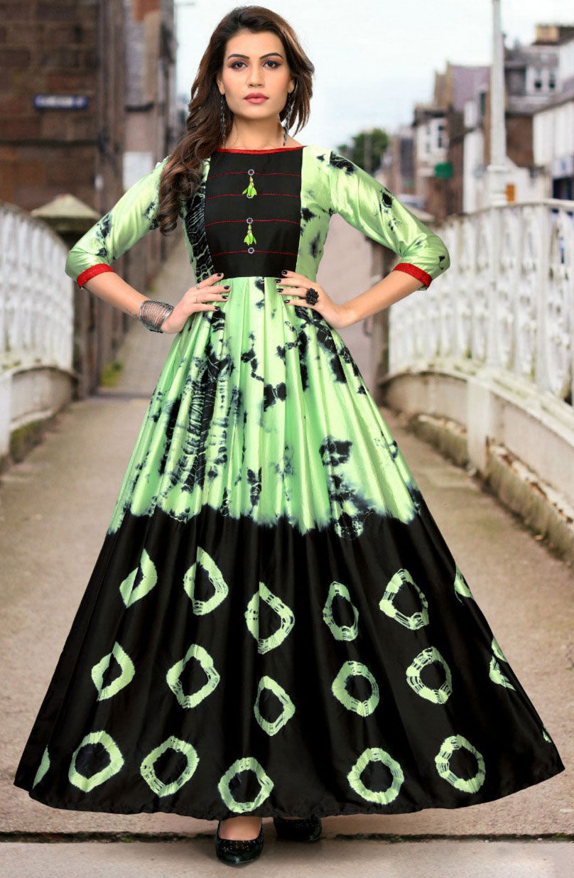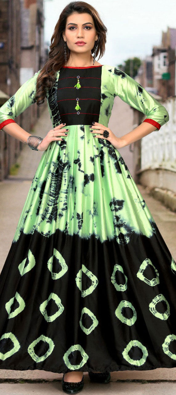 Green color Gown in Satin Silk fabric with Digital Print work