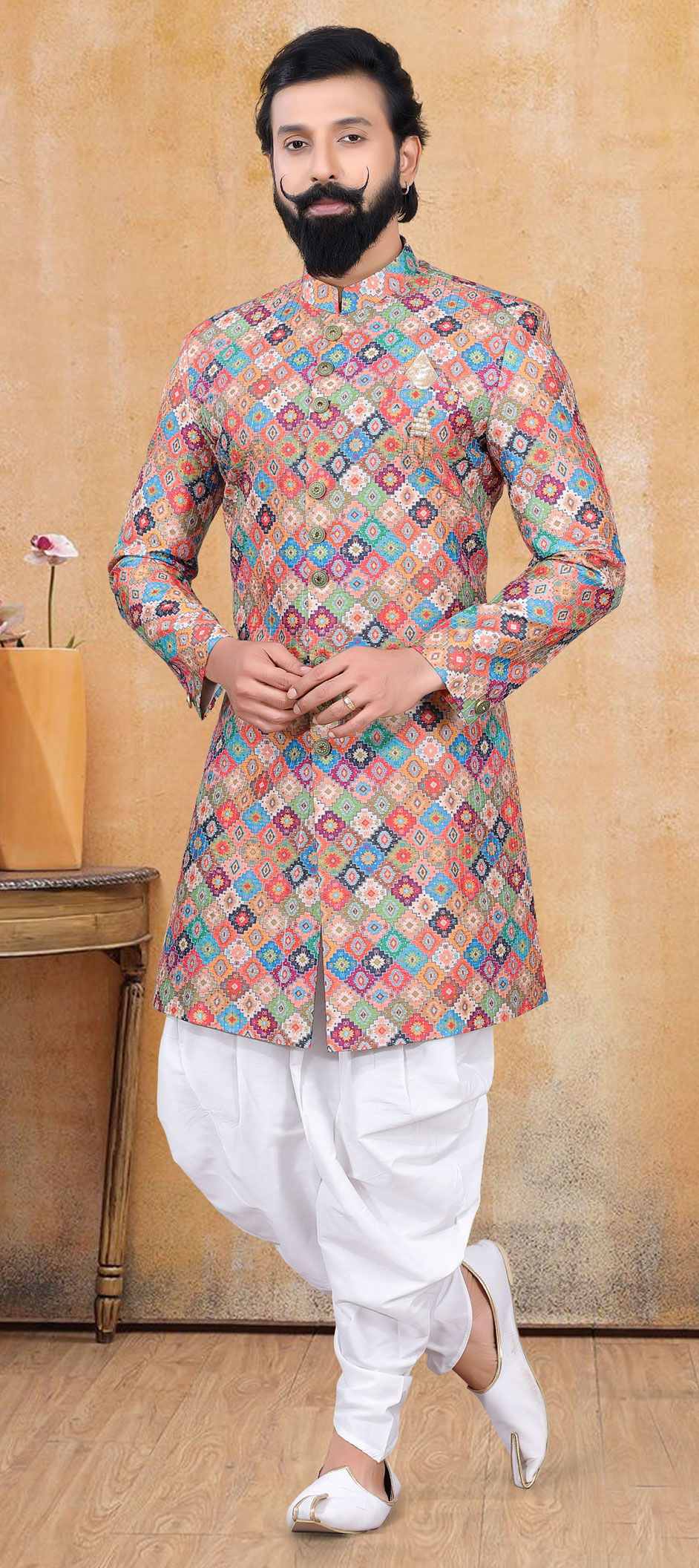 Multicolor color IndoWestern Dress in Art Silk fabric with Broches, Printed work