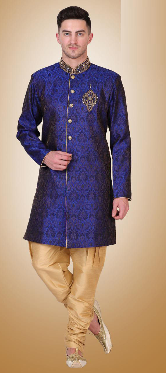 Blue color IndoWestern Dress in Brocade fabric with Patch, Weaving work