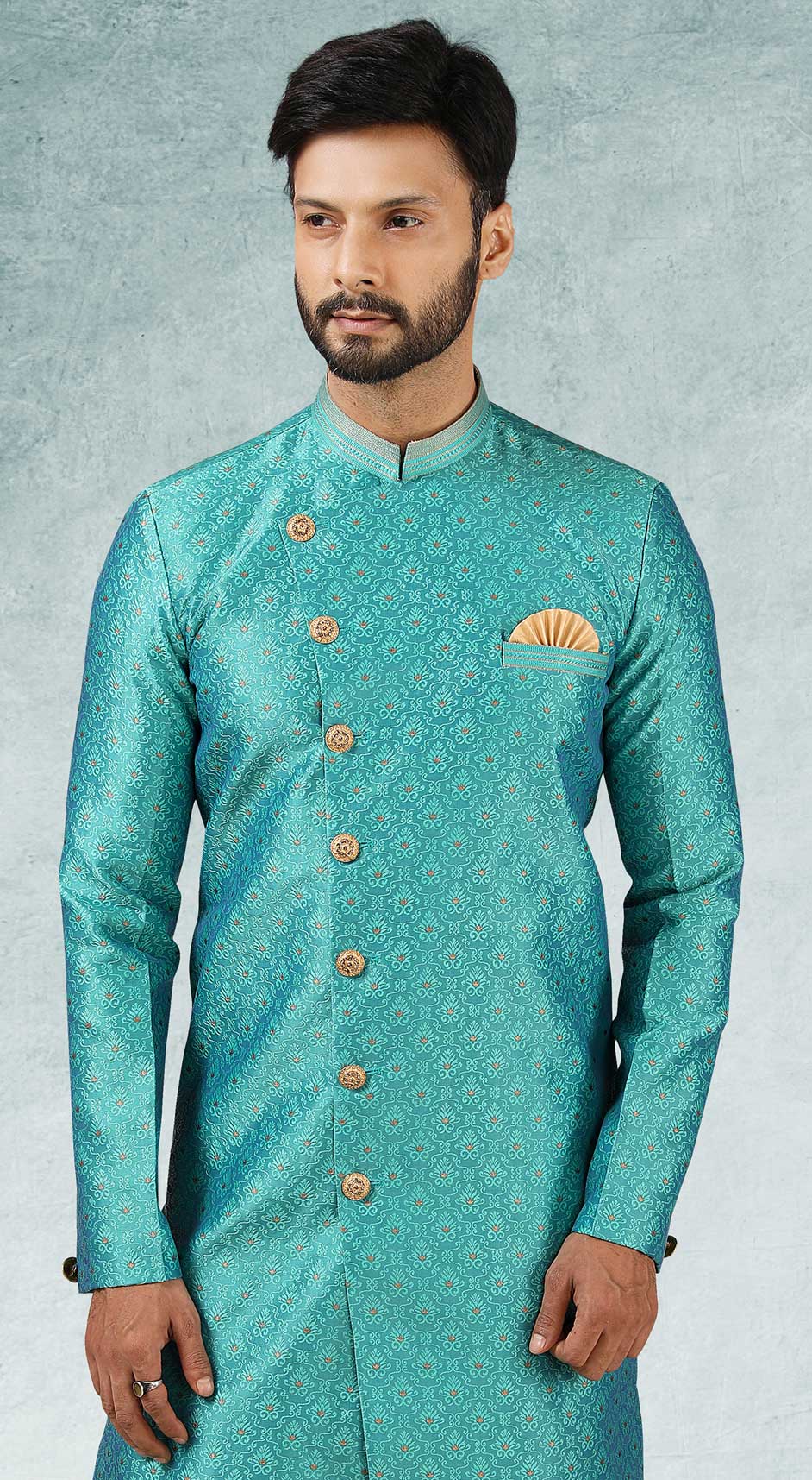 Blue color IndoWestern Dress in Brocade fabric with Weaving work