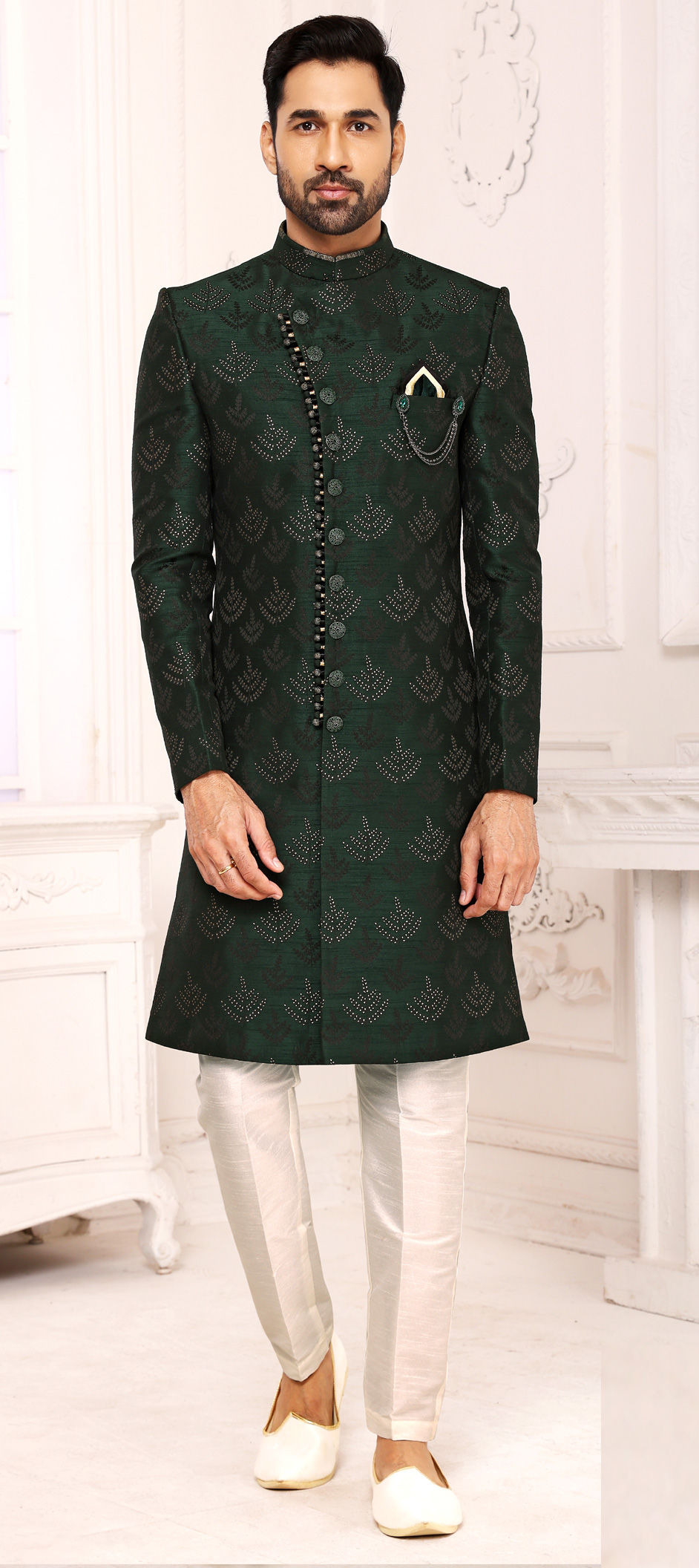Green color IndoWestern Dress in Brocade fabric with Broches, Weaving work