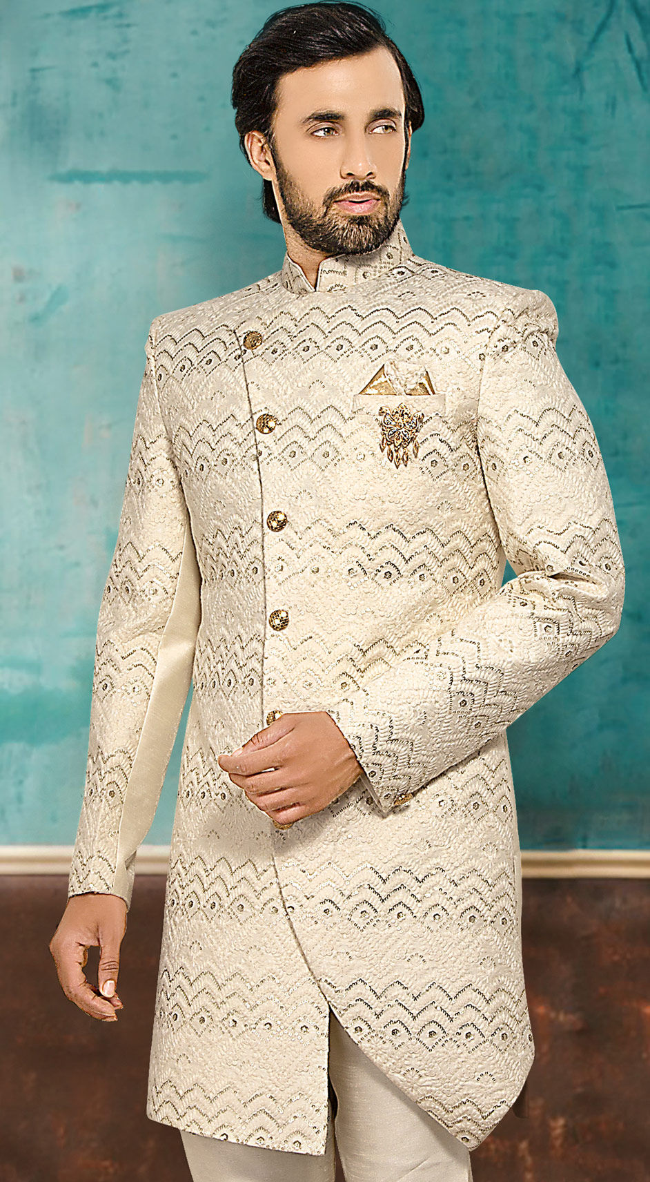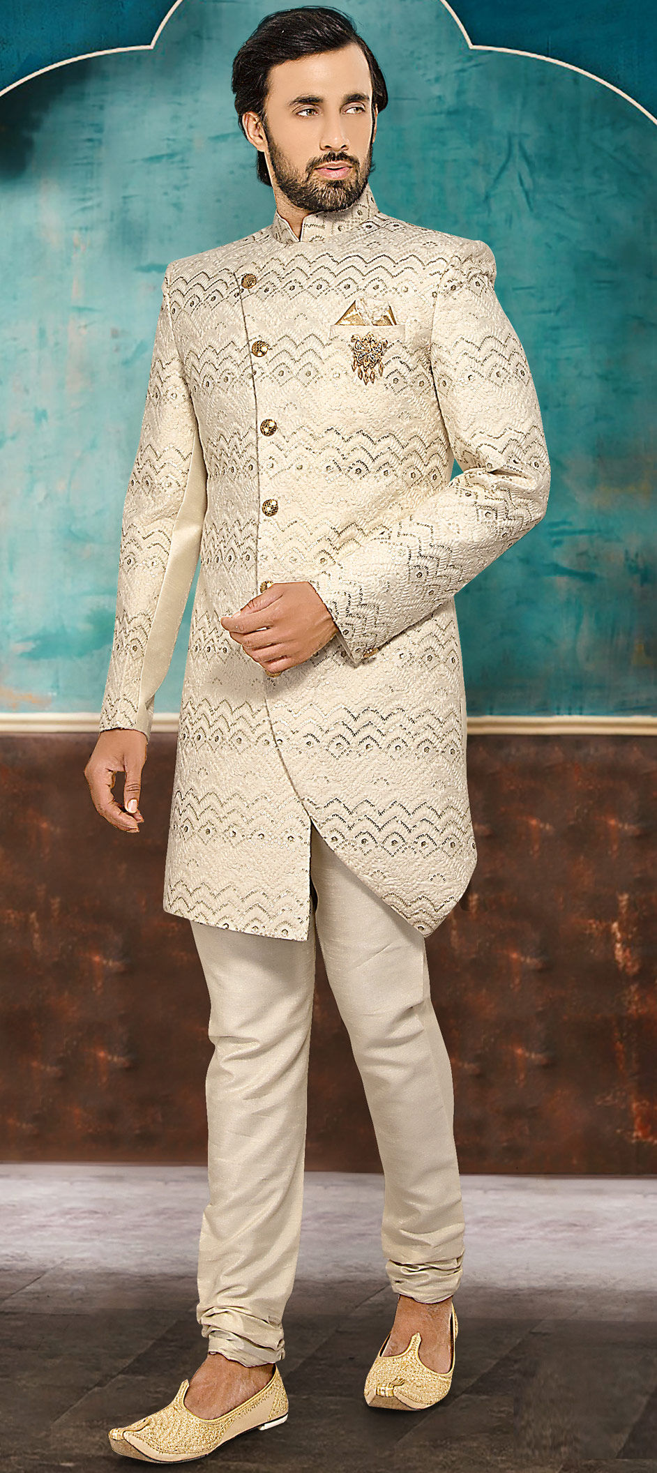 Beige and Brown color IndoWestern Dress in Jacquard fabric with Broches, Embroidered, Sequence, Thread work
