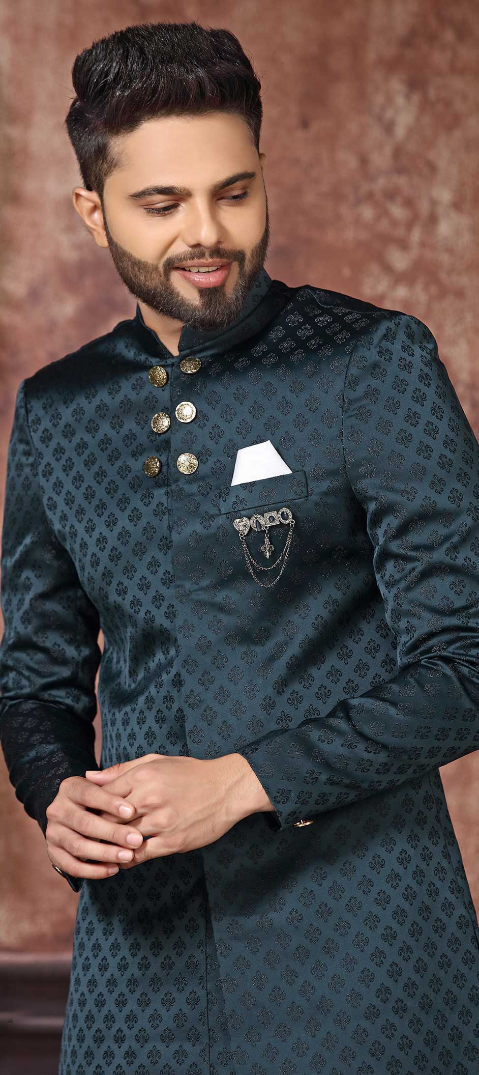 Blue color IndoWestern Dress in Jacquard fabric with Broches, Thread work