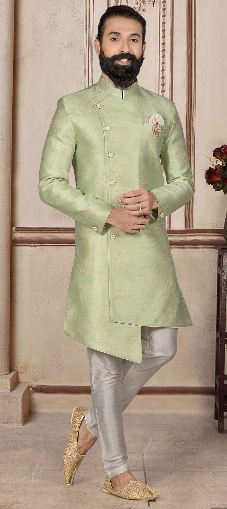 Green color IndoWestern Dress in Jacquard fabric with Broches, Weaving work