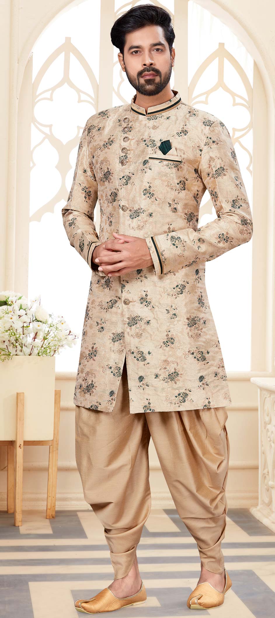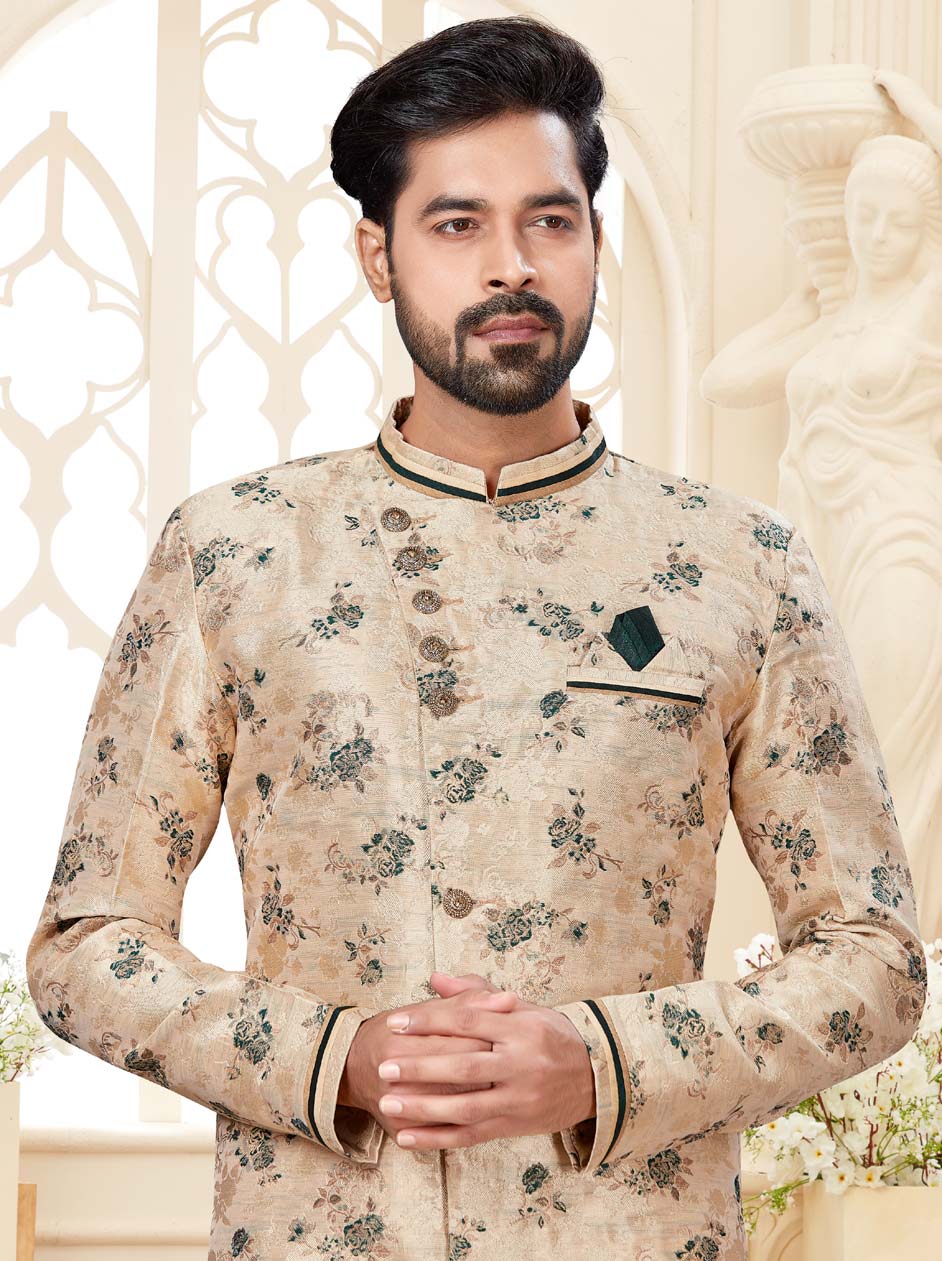 Beige and Brown, Green color IndoWestern Dress in Jacquard fabric with Weaving work