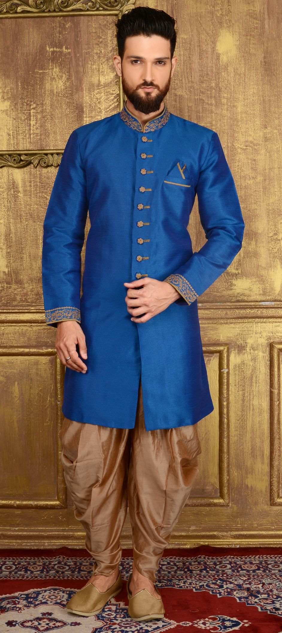 Blue color IndoWestern Dress in Banarasi Silk, Silk fabric with Embroidered, Resham, Thread work