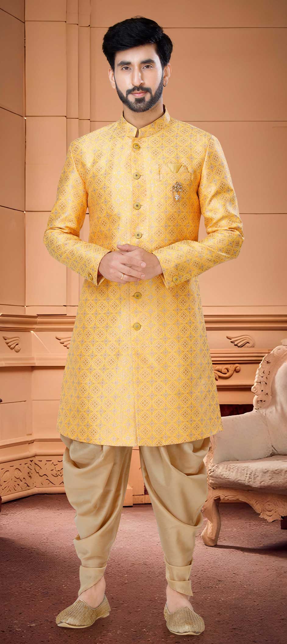 Gold, Yellow color IndoWestern Dress in Silk fabric with Broches, Printed work