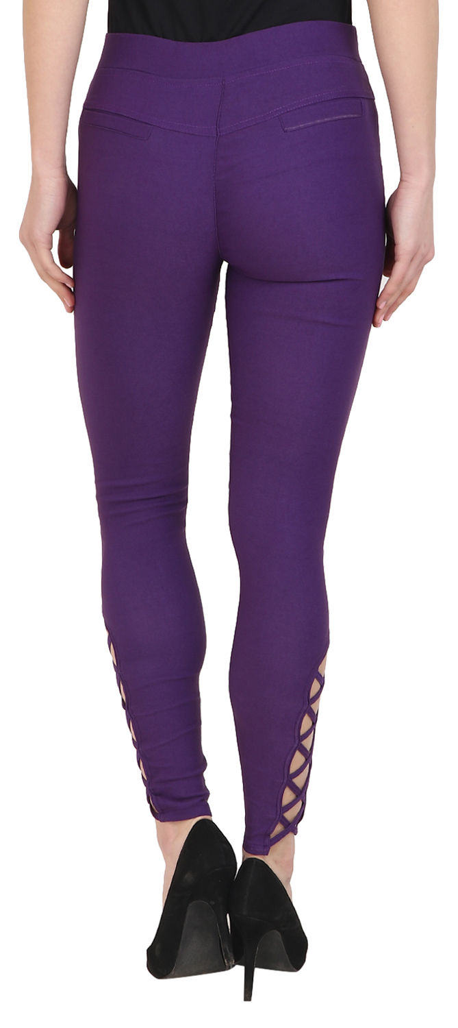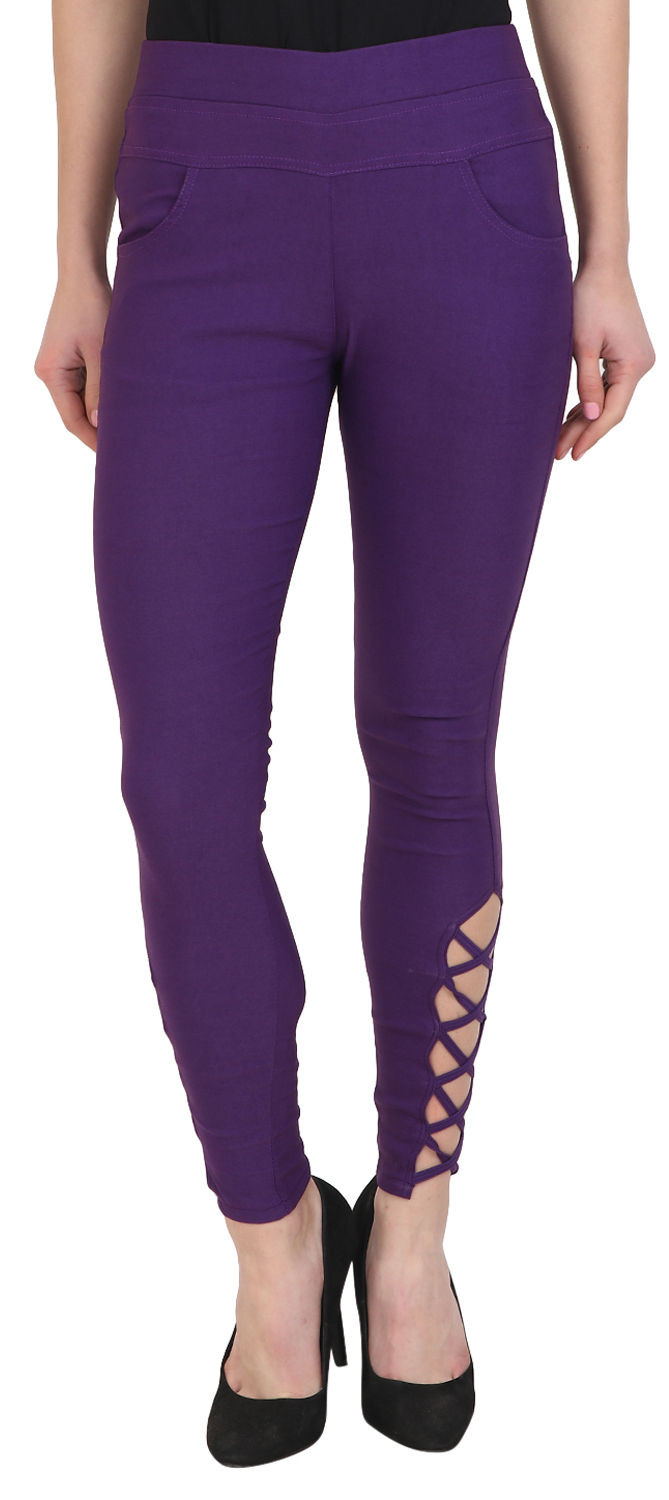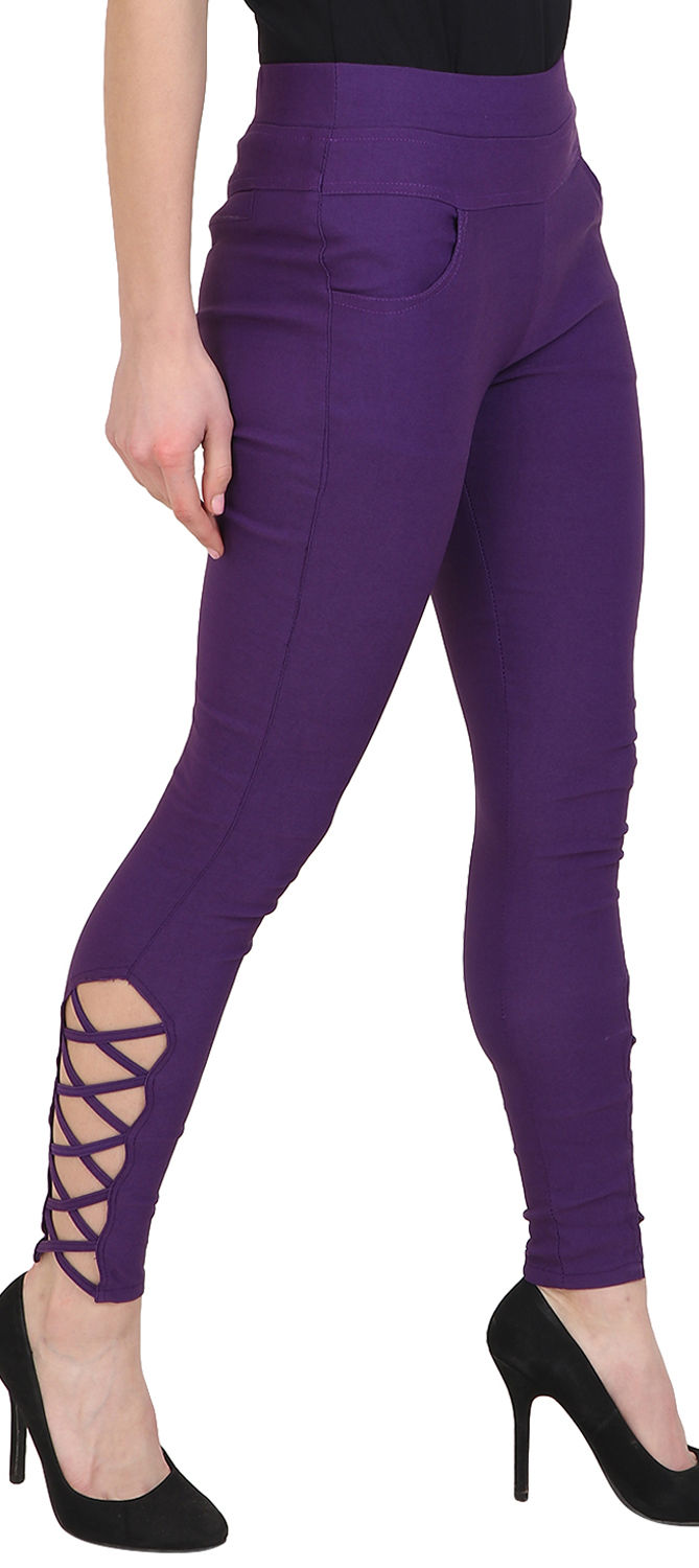 Purple and Violet color Jeggings in Cotton, Lycra fabric with Thread work