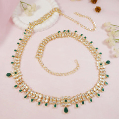 Gold Rodium Polish Green color Waist Chain in Metal Alloy studded with Artificial
