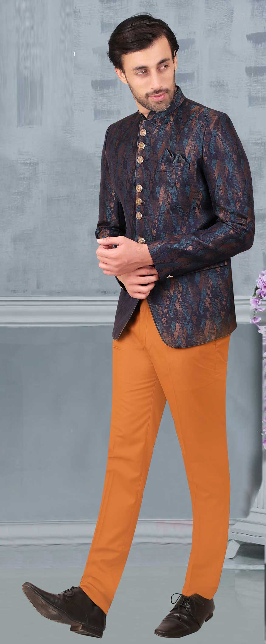 Blue, Gold color Jodhpuri Suit in Rayon fabric with Printed work