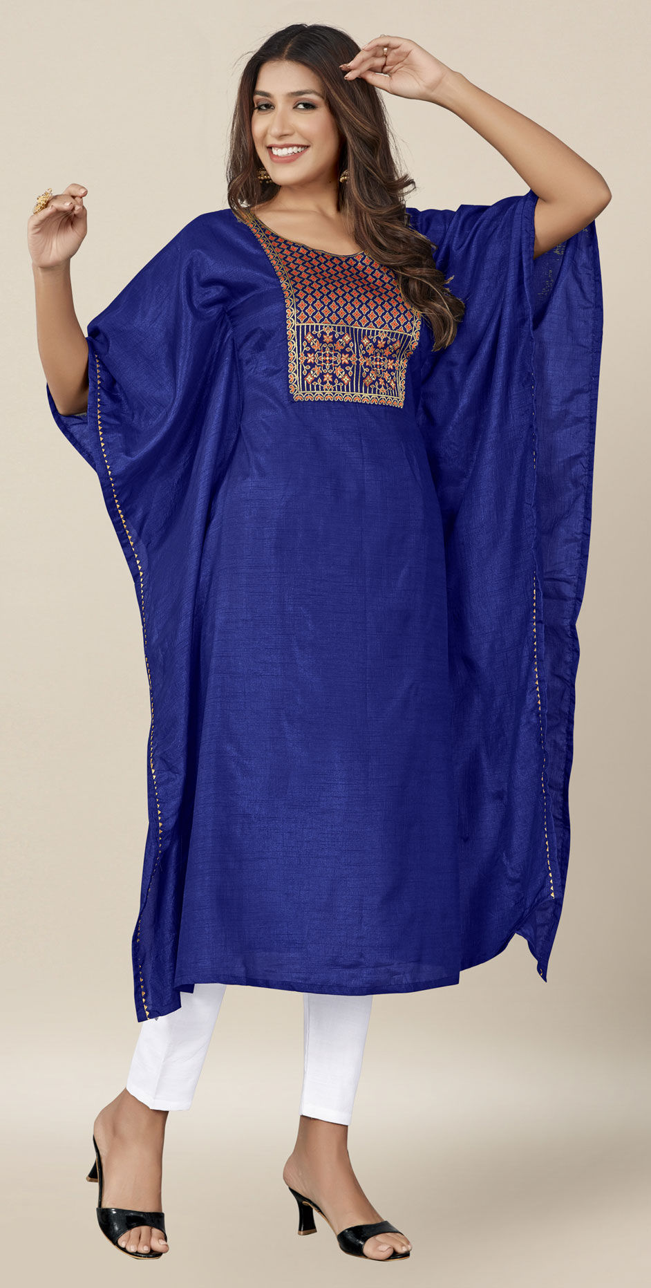 Blue color Kaftan in Dolla Silk fabric with Lace work