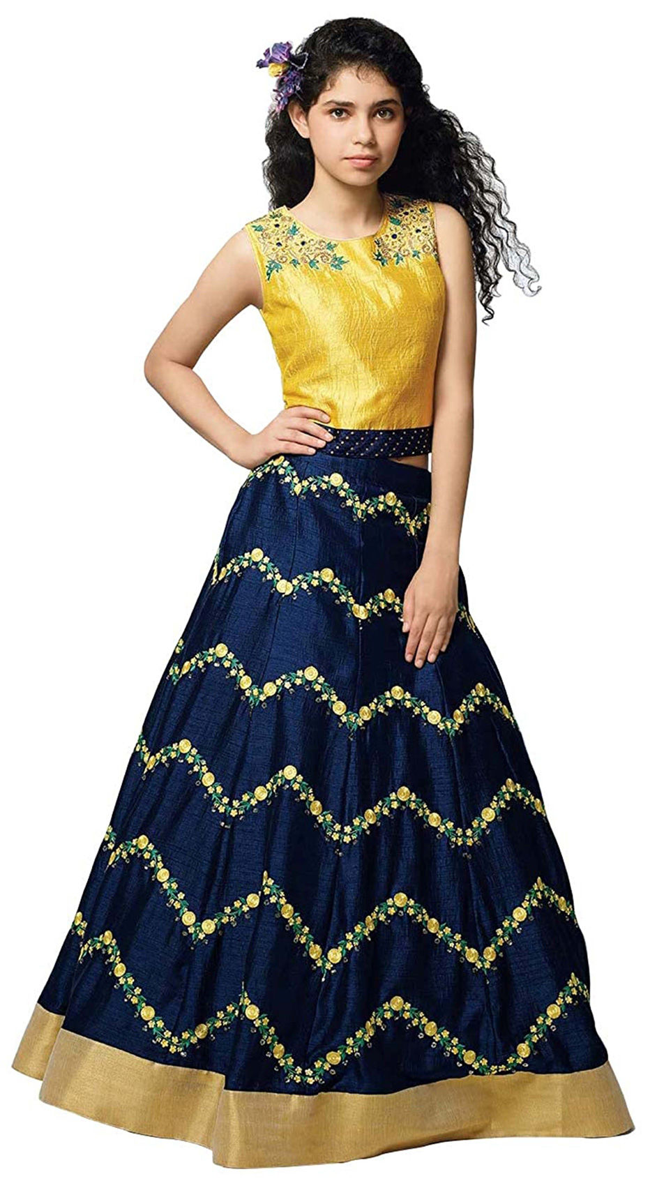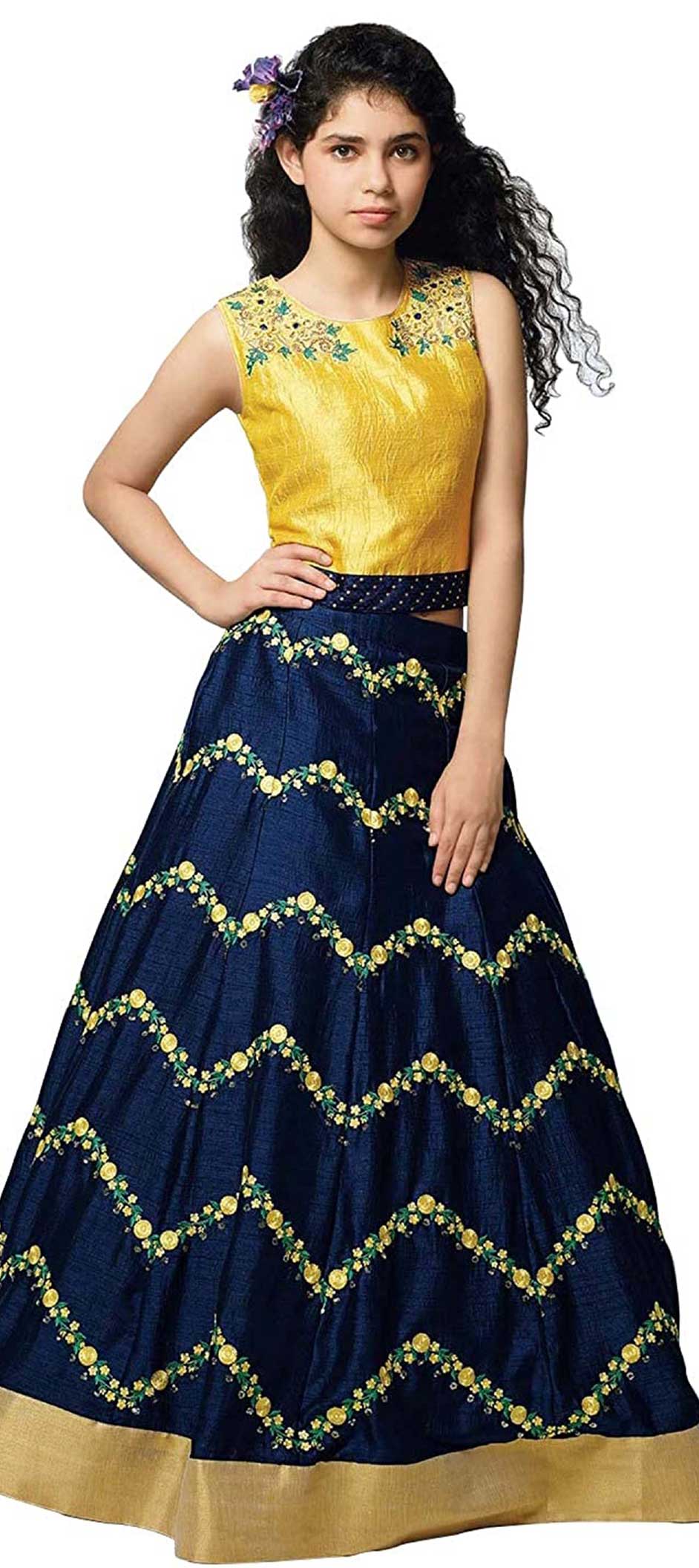 Blue, Yellow color Kids Lehenga in Blended fabric with Embroidered, Resham, Thread work : 1747416
