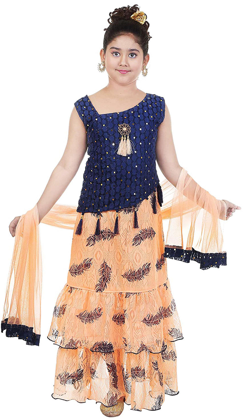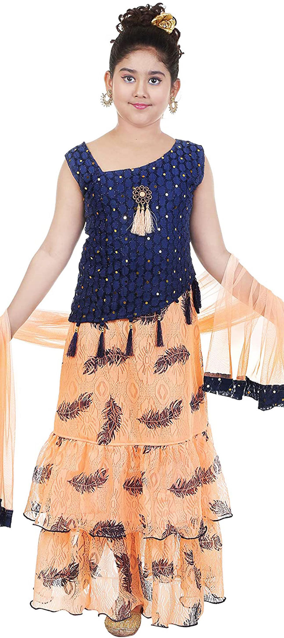 Beige and Brown, Blue color Kids Lehenga in Net, Satin Silk fabric with Printed work : 1722786