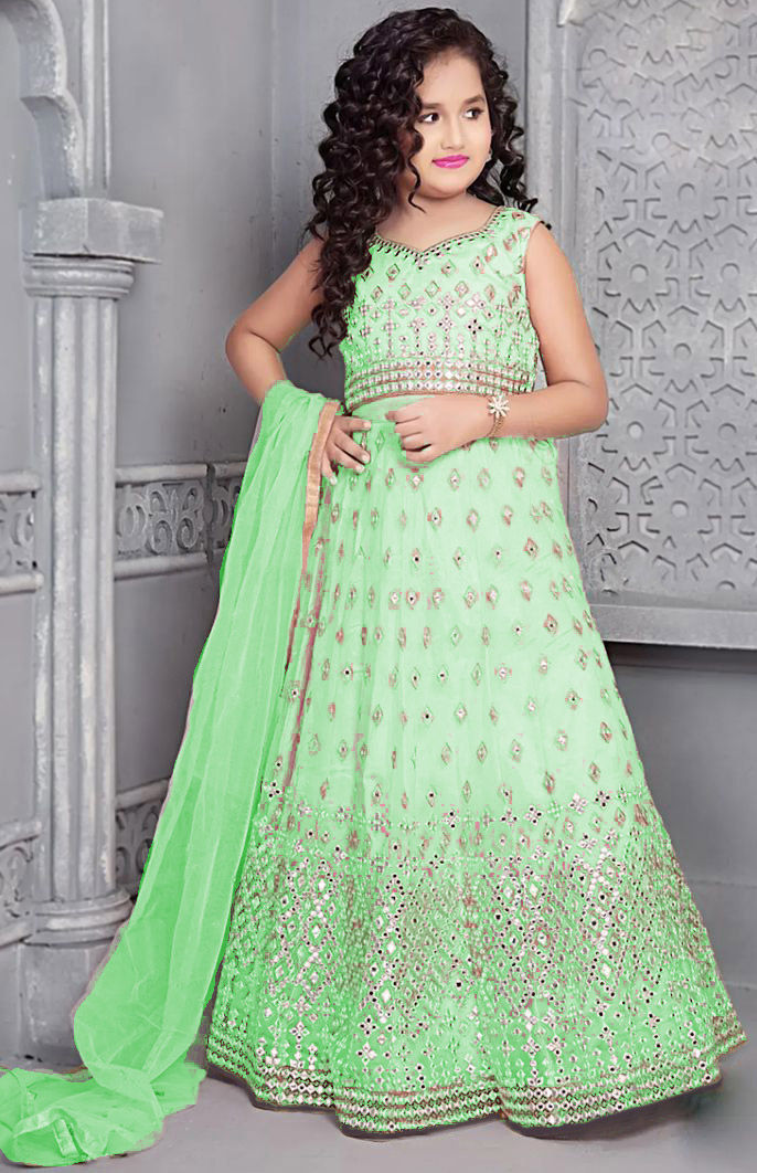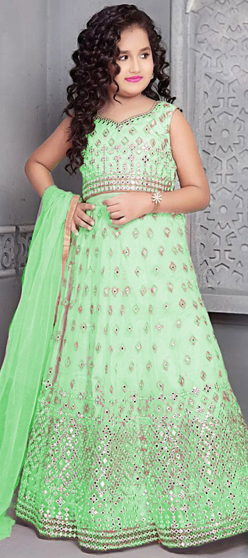 Green color Kids Lehenga in Net fabric with Sequence, Thread work : 1755462