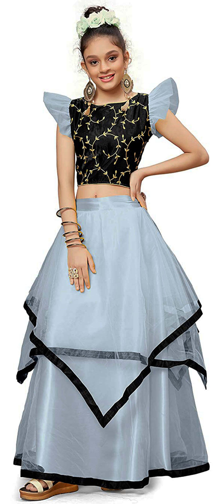 Black and Grey color Kids Lehenga in Net, Satin Silk fabric with Lace, Pleats work : 1707998