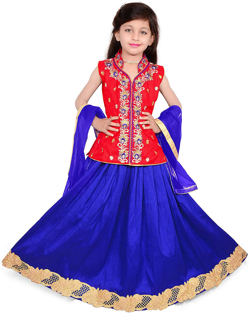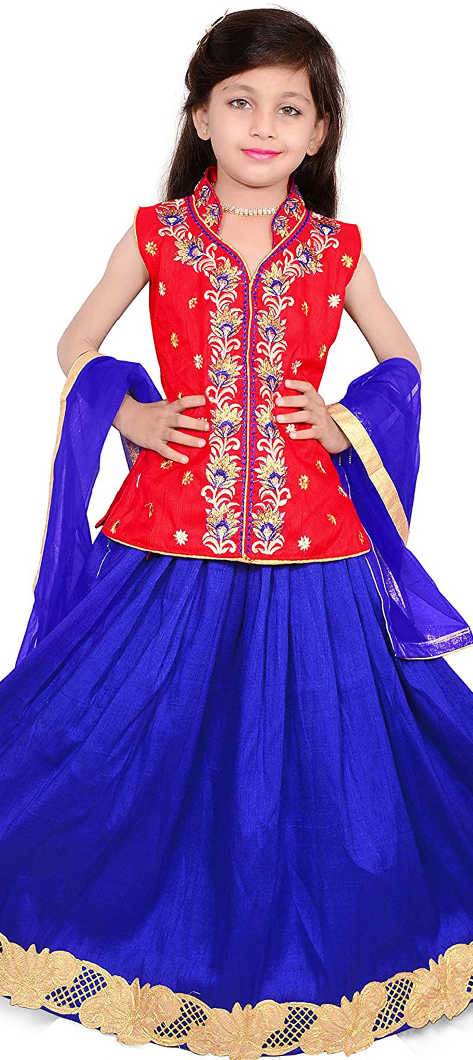 Blue, Red and Maroon color Kids Lehenga in Silk cotton fabric with Embroidered, Thread work : 1722513
