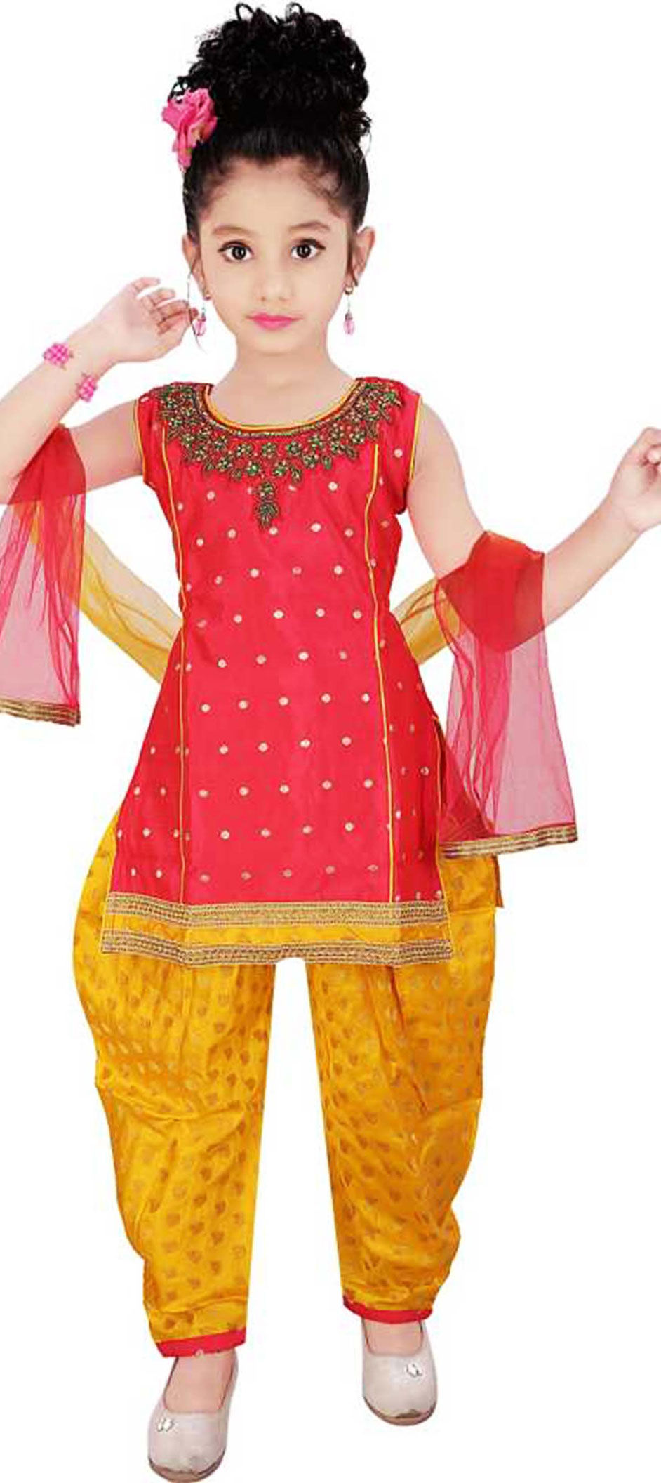 Gold, Pink and Majenta color Kids Salwar in Blended, Jacquard fabric with Bugle Beads, Embroidered, Lace, Thread work : 1764271