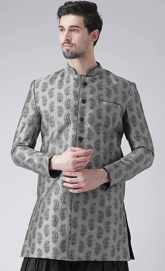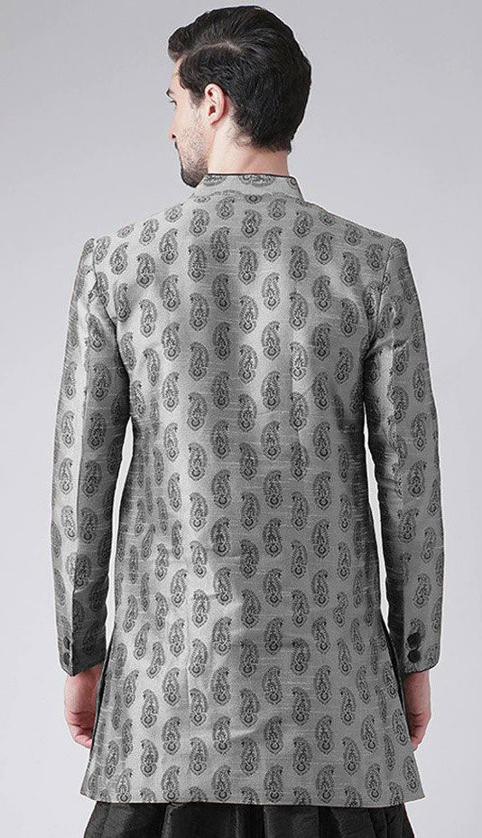 Black and Grey color Kurta in Dupion Silk fabric with Weaving work