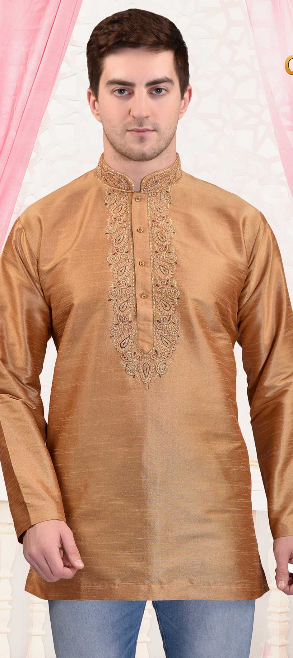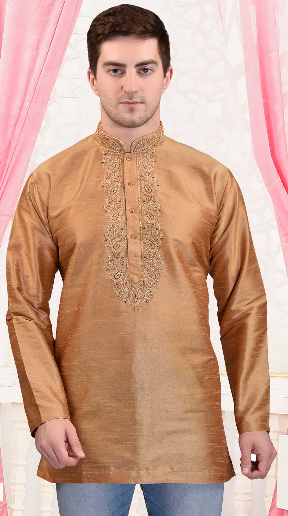 Gold color Kurta in Dupion Silk fabric with Embroidered, Resham, Thread work